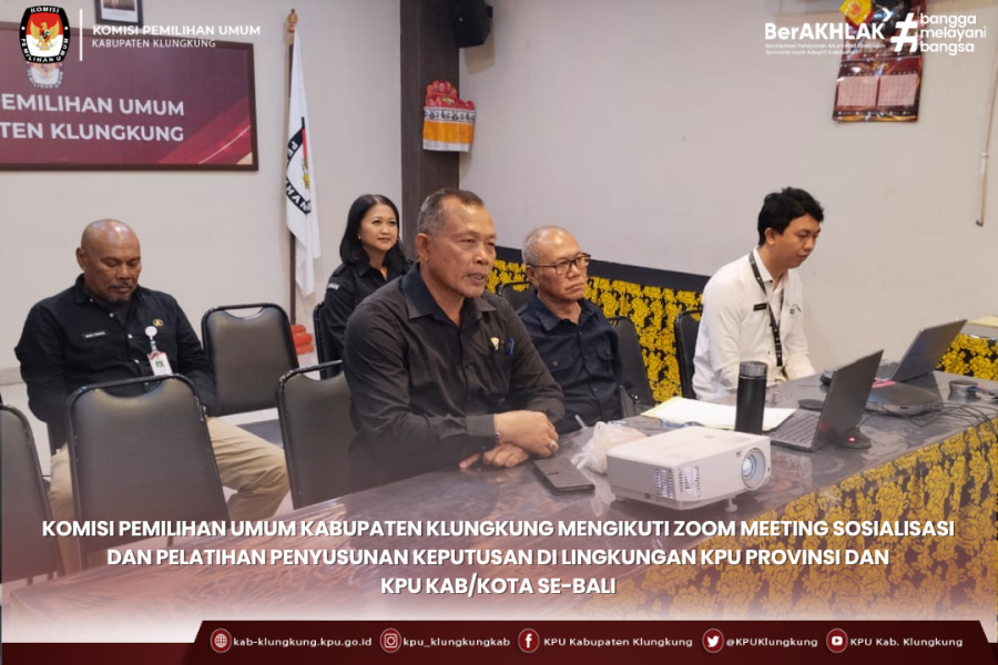 #TemanPemilih, Komisi Pemilihan Umum Kabuoaten Klungkung mengikuti Sosialisasi dan Pelatihan Penyusunan Keputusan di Lingkungan KPU Provinsi dan KPU Kab/Kota se-Bali secara Daring, bertempat di Ruang Rapat KPU Kabupaten Klungkung, Rabu (22/10/2025) Kegiatan diawali dengan sambutan dan arahan KPU Provinsi Bali. Pelatihan ini dalam rangka meningkatkan kapasitas, pemahaman dan kemampuan dalam menyusun rancangan keputusan sesuai dengan ketentuan peraturan perundang-undangan serta pedoman tata naskah dan prosedur penyusunan keputusan di Lingkungan KPU. Kegiatan ini diikuti oleh Ketua dan Anggota KPU Kabupaten Klungkung dan Kasubbag Teknis dan Hukum beserta staff. #KPUMelayani ....