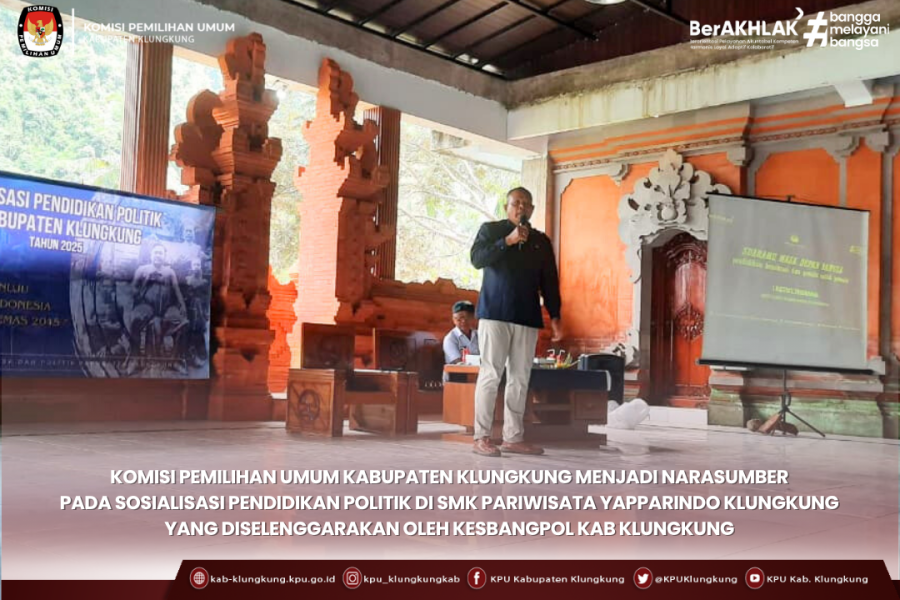 #TemanPemilih, Komisi Pemilihan Umum Kabupaten Klungkung menjadi Narasumber pada Sosialisasi Pendidikan Politik yang diselenggarakan oleh Kesbangpol Kabupaten Klungkung, bertempat di SMK Pariwisata Yapparindo Klungkung, Kamis (23/10/2025) Kegiatan dibuka oleh Kepala Sekolah SMK Pariwisata Yapparindo Klungkung, I Wayan Dharmayasa, serta sambutan dari Badan Kesbangpol Kabupaten Klungkung, I Dewa Ketut Sueta Negara. Ketua KPU Kabupaten Klungkung, I Ketut Sudiana sebagai Narasumber memberikan Sosialisasi Pendidikan Pemilih Pemula kepada siswa/i SMK Yapparindo Klungkung. #KPUMelayani ....