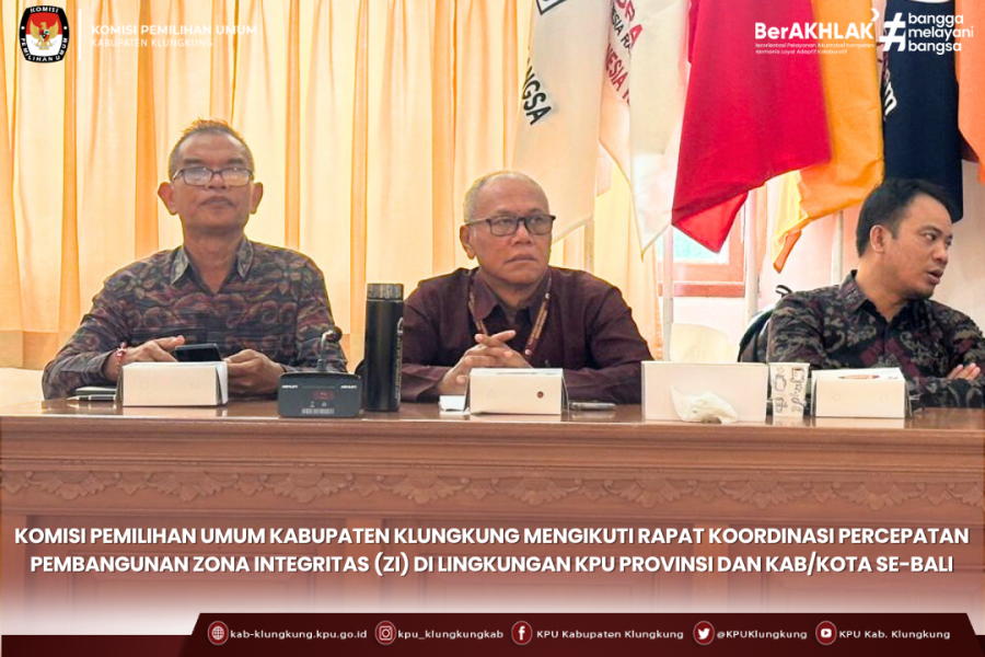 #TemanPemilih, Komisi Pemilihan Umum Kabupaten Klungkung mengikuti Rapat Koordinasi Percepatan Pembangunan Zona Intrgritas (ZI) di Lingkungan KPU Provinsi dan Kab/Kota se-Bali, bertempat di Ruang Rapat KPU Provinsi Bali, Jumat (24/10/2025) Kegiatan ini dibuka sekaligus arahan dari KPU Provinsi Bali. Pada kesempatan tersebut Anggota KPU Provinsi Bali Divisi Hukum dan Pengawasan meminta kepada Komitmen Pimpinan sebagai Role Model di KPU Kab/Kota untuk serius membangun Zona Integritas (ZI) menuju WBK/WBBM di Satuan Kerja masing-masing. Hadir dalam kegiatan ini Ketua Divisi Hukum dan Pengawasan, I Komang Artawan, Sekretaris dan Kasubbag Teknis dan Hukum. #KPUMelayani ....