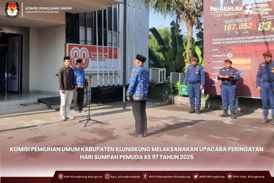#TemanPemilih, Komisi Pemilihan Umum Kabupaten Klungkung melaksanakan Upacara Peringatan Hari Sumpah Pemuda Ke 97 Tahun 2025, bertempat di Kantor KPU Kabupaten Klungkung, Selasa (28/10/2025) Kegiatan ini dipimpin oleh Ketua Divisi Teknis Penyelenggara, I Gede Suka Astreawan sebagai Inspektur Upacara. Kasubbag Teknis dan Hukum sebagai Komandan Upacara. Kegiatan ini diikuti oleh seluruh Jajaran KPU Kabupaten Klungkung. #KPUMelayani ....