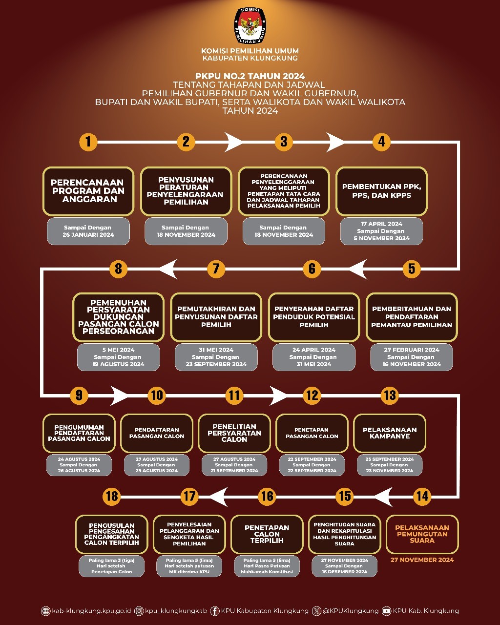 PKPU Nomor 2 Tahun 2024 Tentang Tahapan Pemilihan Gubernur dan Wakil Gubernur, Bupati dan Wakil Bupati, serta Walikota dan Wakil Walikota Tahun 2024 Senin, 01 April 2024 07:00 808 PKPU Nomor 2 Tahun 2024 Tentang Tahapan Pemilihan Gubernur dan Wakil Gubernur, Bupati dan Wakil Bupati, serta Walikota dan Wakil Walikota Tahun 2024 Baca Selengkapnya