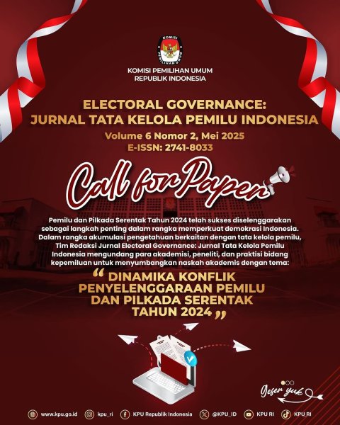 #TemanPemilih, kamu perlu tahu Electoral Governance: Jurnal Tata Kelola Pemilu Indonesia Volume 6 Nomor 2, Mei 2025 membuka call for paper dengan tema “Dinamika Konflik Penyelenggaraan Pemilu dan Pilkada Serentak Tahun 2024”. Catat tanggal pentingnya dan pastikan tulisanmu masuk ke dalam Jurnal Tata Kelola Pemilu yaa… ????