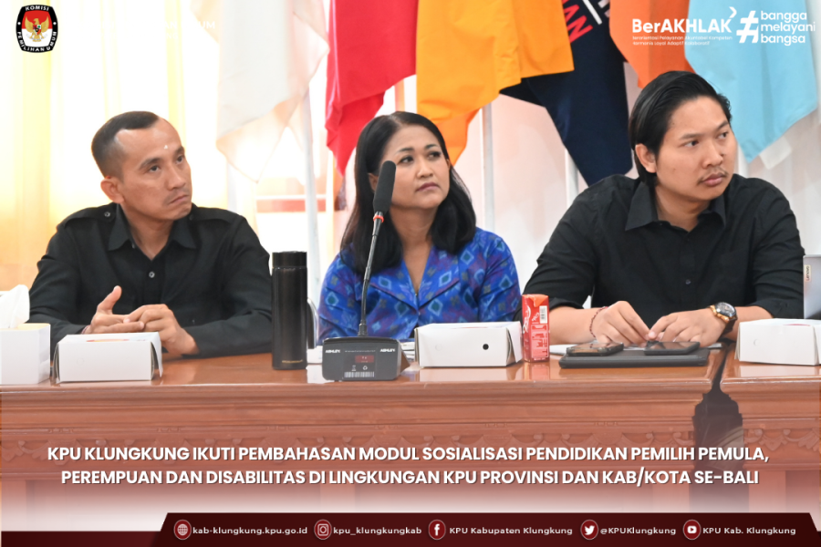 #TemanPemilih, Ketua Divisi Sosialisasi Pendidikan Pemilih Partisipasi Masyarakat dan SDM Komisi Pemilihan Umum (KPU) Kabupaten Klungkung, Luh Putu Inten Pradnyani didampingi Kasubbag Anak Agung Gede Wisnu mengikuti pembahasan modul yang dirancang KPU Kabupaten/Kota se Bali, Rabu (25/2/26) bertempat di ruang rapat Kantor KPU Provinsi Bali.