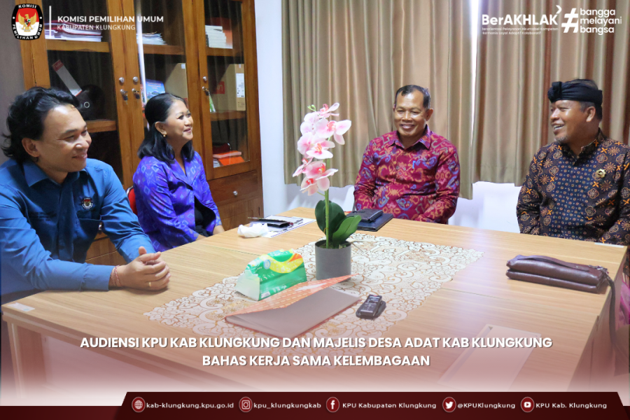 Audiensi ini diikuti oleh Ketua dan Anggota KPU Kabupaten Klungkung bersama Kasubbag Parmas dan SDM KPU Kabupaten Klungkung. Pertemuan tersebut membahas rencana kerja sama antara KPU Kabupaten Klungkung dan MDA Kabupaten Klungkung dalam rangka penguatan sinergi kelembagaan.