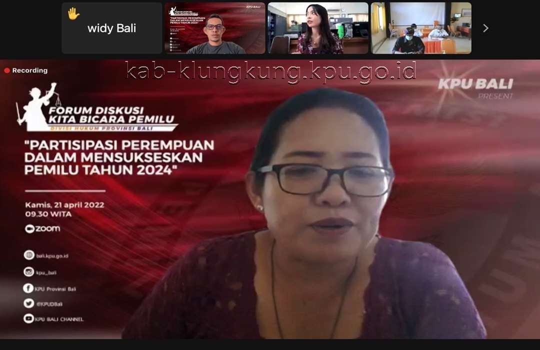 #TemanPemilih,Ketua,Anggota bersama pejabat struktural mengikuti Diskusi Kita Bicara Pemilu dengan “ Partisipasi Perempuan dalam Mensukseskan Pemilu Tahun 2024” secara daring, kamis (21/4). Diskusi dengan narasumber dari Komisi Penyelenggaraan Perlindungan Anak Daerah (KPPAD) Provinsi Bali Ni Luh Gede Yastini, Ni Wayan Yudiartini Anggota Komisi Penyiaran Indonesia Daerah(KPID)Bali, Luh Putu Sri Widyastini Anggota KPU Provinsi Bali, Ketut Ariyani Ketua Bawaslu Bali, Akademisi Ni Wayan Widiastini dengan moderator Ni Luh Kusmirayanti Anggota KPU Kabupaten Karangasem.