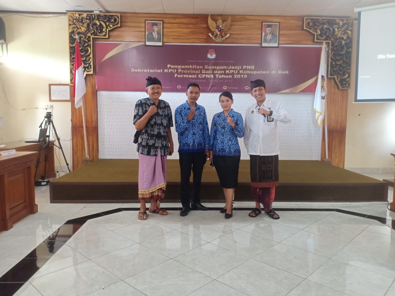 Dua PNS di KPU Klungkung Diambil Sumpah Janjinya Dua Pegawai Negeri Sipil ( PNS) di KPU Klungkung dari formasi CPNS 2019, yakni M.Nurseha Prasetyo dan Zyhan Natasya diambil sumpah janjinya dalam acara pengambilan sumpah janji PNS di KPU Bali, dengan disaksikan rokhaniawan, Kamis (10/3). Dalam acara yang dihadiri Ketua dan anggota serta sekretaris KPU Provonsi Bali dan Ketua dan sekretaris KPU kabupaten/ kota se- Bali itu mendapatkan motivasi dari Ketua KPU Bali, Dewa Agung Gede Lidartawan. Mantan Ketua KPU Bangli ini dalam sambutannya berharap PNS yang baru mampu menjaga kekompakan dan meningkatkan kreatifitas sebagai agen perubahan yang mesti bergerak maju dan cepat. Dia juga mengatakan bekerja di KPU beda dengan bekerja di institusi lain, dimana akan berhadapan dengan sanksi pelanggaran kode etik dan bakal bisa berujung di DKPP-kan. Karena itu Lidartawan menekankan pentingnya kerja disiplin dan penuh semangat dan mengikuti peraturan ketentuan peratiran perundang- undangan yang berlaku. Untuk diketahui M.Nur Prasetyo dan Zyhan Natasya sudah aktif melaksanakan tugas sejak berstatus CPNS di KPU Klungkung.Tampaknya tingkat kehadiran mereka di.kantor KPU cukup baik.( sum)