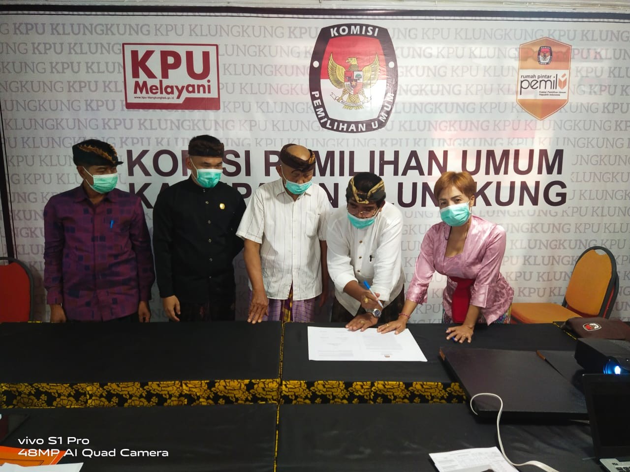 Masing- masing komisioner, I Gusti Lanang Nega Saskara, Gede Suka Astreawan, Sang Ayu Mudiasih, Ida Bagus Barwata dan I Wayan Sumerta melakukan tanda tangan. Demikian juga Sekretaris KPU yang baru, I Putu Gde Eka Swambara dan Kasubbag juga bertanda tangan.