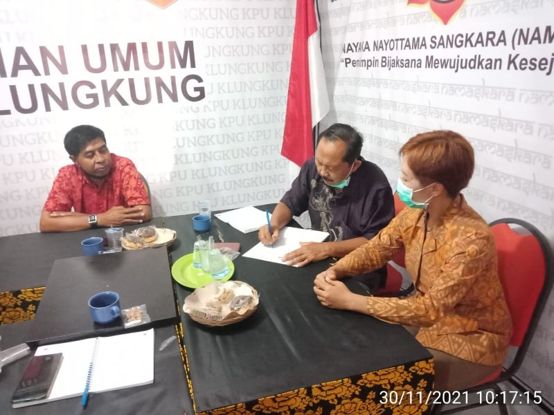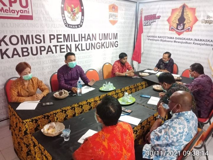 #TemanPemilih KPU Kabupaten Klungkung laksanakan rapat pleno rutin mingguan, senin (29/11/2021) bertempat di ruang rapat. Rapat menghasilkan keputusan kegiatan yang akan dilakukan selama seminggu kedepan, seperti rapat evaluasi JDIH, rapat penyusunan pengelolaan logistik rapat pleno pemutakhiran data pemilih berkelanjutan, menghadiri simulasi pemungutan dan penghitungan suara di KPU Provinsi Bali, rapat koordinasi dengan instansi terkait, pengelolaan migrasi website KPU Klungkung serta kegiatan lainnya.