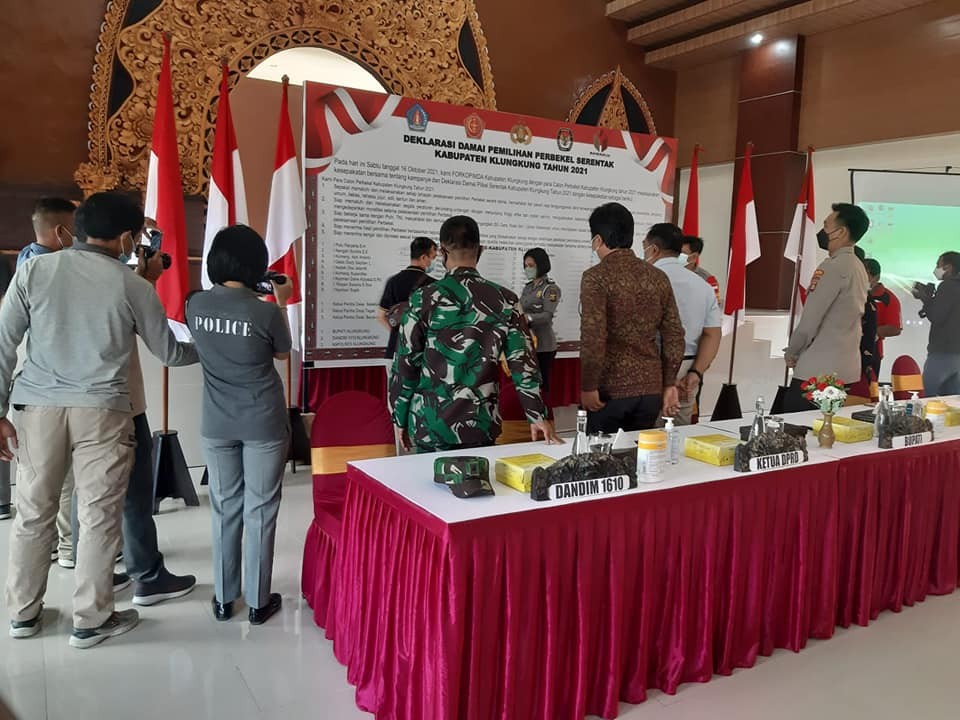 Komisioner KPU Klungkung dari Divisi Hukum dan Pengawasan, Wayan Sumerta menghadiri deklarasi damai ( dekdam) pemilihan perbekel serentak, di Mapolres Klungkung, Sabtu (16/10).