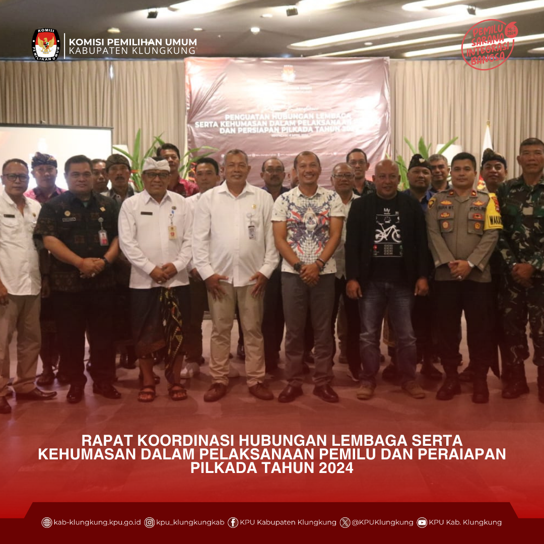 #TemanPemilih , Kamis, 4 April 2024 KPU Kabupaten Klungkung melaksanakan Rapat Koordinasi Penguatan Hubungan Lembaga serta Kehumasan dalam Pelaksanaan Pemilu dan Persiapan Pilkada Serentak Tahun 2024 sekaligus ditutup dengan acara Buka Puasa Bersama. Turut Hadir dalam acara tersebut Ketua Divisi Sosialisasi, Pendidikan Pemilih, Partisipasi Masyarakat dan SDM KPU Provinsi Bali, Forkopimda Kabupaten Klungkung, Bawaslu Kabupaten Klungkung, Instansi Terkait, Camat se-Kabupaten Klungkung, Forum Perbekel dan juga media di Kabupaten Klungkung. #KPUKlungkung #KPUMelayani