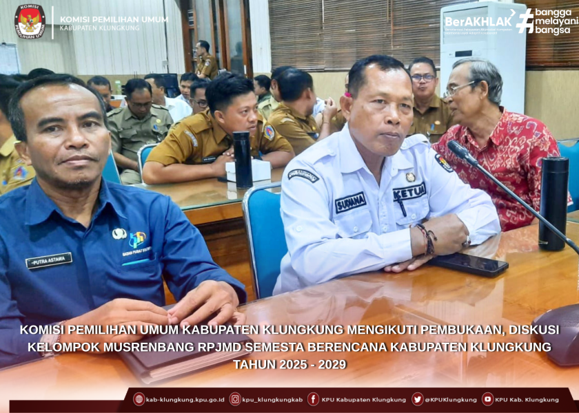 #TemanPemilih, Komisi Pemilihan Umum Kabupaten Klungkung mengikuti Diskusi Kelompok Musrenbang RPJMD Semesta Berencana Kabupaten Klungkung Tahun 2025 - 2029, bertempat di Ruang Praja Mandala Kantor Bupati Klugkung, Senin (23/6/2025)