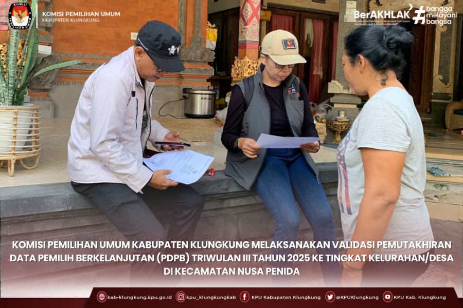 #TemanPemilih, Komisi Pemilihan Umum Kabupaten Klungkung melaksanakan kegiatan Validasi data tingkat Desa/Kelurahan di Kecamatan Nusa Penida Hari Kedua terkait dengan Pemutakhiran Data Pemilih Berkelanjutan (PDPB) Triwulan III Tahun 2025, Senin (29/9/25). Tujuan Kegiatan Validasi Data ke Kantor Desa,untuk klarifikasi data pemilih agar sesuai dengan elemen data, seperti data tidak padan, pindah keluar, pindah masuk, potensial pemilih baru dan pemilih yang dinyatakan meninggal dunia tanpa adanya keterangan akte kematian untuk memastikan bahwa yang bersangkutan memang sudah meninggal dunia dan mempunyai data dukung yang valid seperti akta kematian atau surat keterangan kematian dari kantor Desa/Kelurahan. Kegiatan yang dilaksanakan oleh Divisi Perencanaan, Data dan Informasi, Made Dwi Adnyana Putra menyasar ke Desa Batukandik, Desa Sekartaji, Desa Tanglad, Desa Pejukutan dan Desa Suana. Kemudian Divisi Hukum dan Pengawasan, I Komang Artawan menyasar ke Desa Ped, Desa Kutampi Kaler dan Desa Batununggul. Sedangkan Divisi Sosdiklih, Parmas dan SDM, Luh Putu Inten Pradnyani, menyasar ke Desa Kampung Toyapakeh. Kegiatan ini dilaksanakan bersama Bawaslu Kabupaten Klungkung dan Staf Pelaksana. #KPUMelayani
