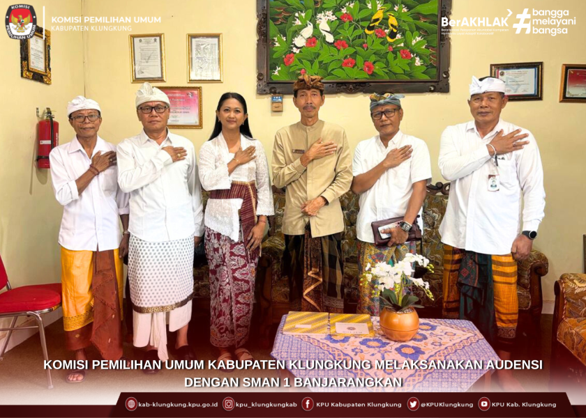 Kegiatan ini dihadiri oleh Ketua dan Anggota KPU Kabupaten Klungkung, serta diterima langsung oleh Kepala Sekolah SMAN 1 Banjarangkan, I Dewa Gede Anom, S.Pd, dan Waka Urusan Kemasyarakatan, I Kadek Suantika, S.Pd.
