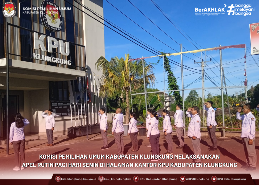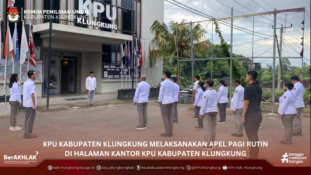 Apel rutin hari ini dipimpin oleh Sekretaris KPU Kabupaten Klungkung, diikuti oleh seluruh jajaran KPU Kabupaten Klungkung dan mahasiswa magang.