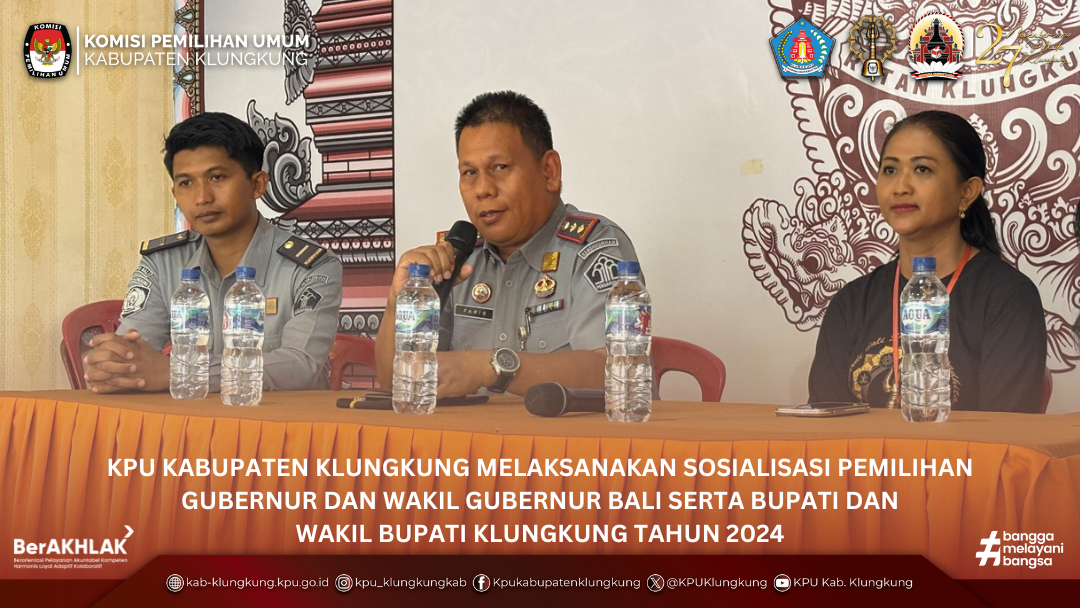 Kegiatan ini dipimpin oleh Ketua KPU Kabupaten Klungkung, I Ketut Sudiana. Divisi Teknis Penyelenggara, I Gede Suka Astreawan, hadir di Kecamatan Banjarangkan. Divisi Sosdiklih Parmas dan SDM, Luh Putu Inten Pradnyani, hadir di Kecamatan Dawan. Divisi Hukum dan Pengawasan, I Komang Artawan, hadir di Kecamatan Klungkung. Divisi Perencanaan Data dan Informasi, Made Dwi Adnyana Putra, hadir di Kecamatan Nusa Penida.