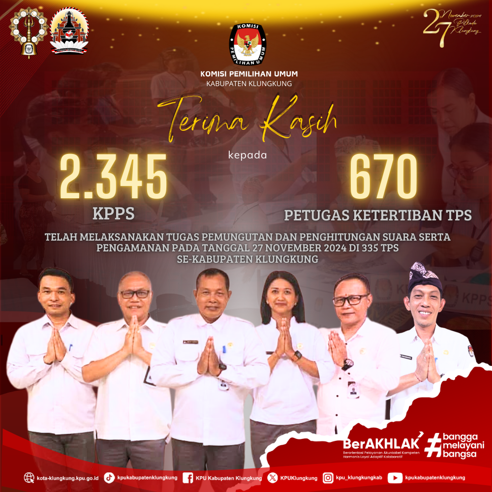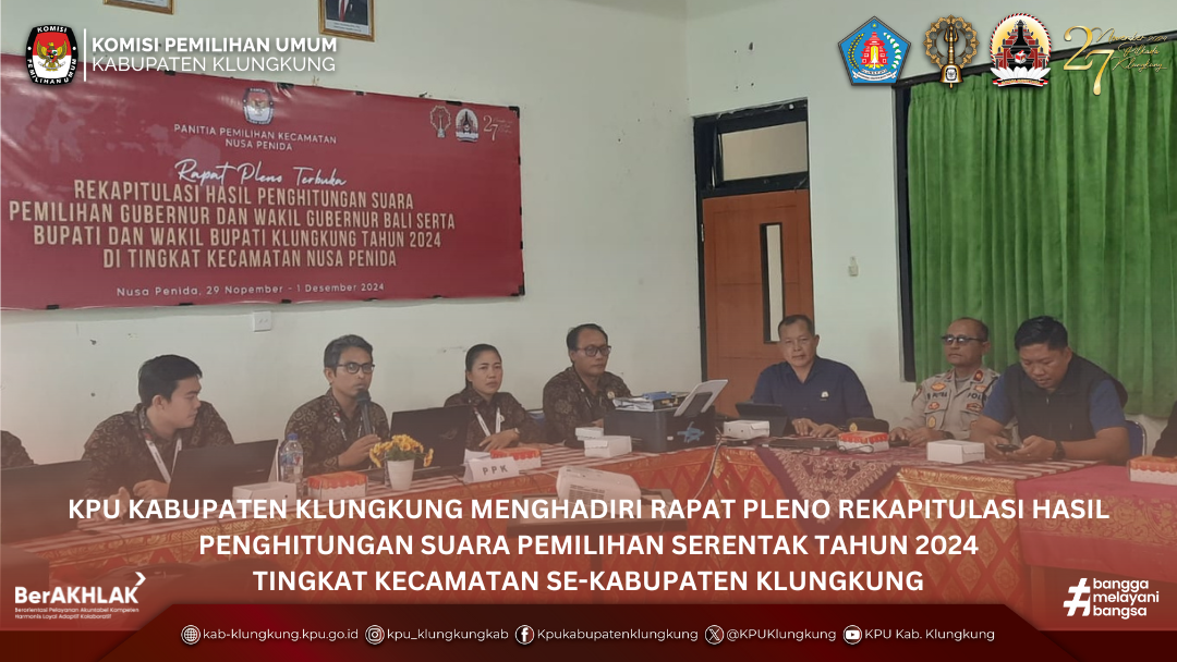 #TemanPemilih, Komisi Pemilihan Umum Kabupaten Klungkung menghadiri Rapat Pleno Rekapitulasi Penghitungan Suara Pemilihan Gubernur dan Wakil Gubernur Bali serta Bupati dan Wakil Bupati Klungkung Tahun 2024 Tingkat Kecamatan se-Kabupaten Klungkung, Minggu (1/12).