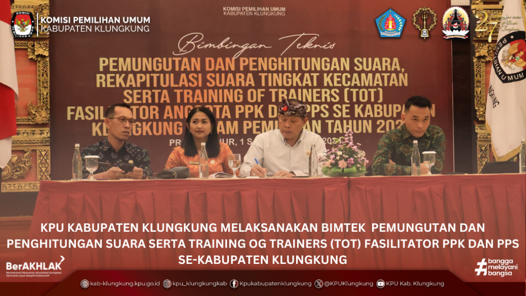 #TemanPemilih, Komisi Pemilihan Umum Kabupaten Klungkung melaksanakan kegiatan Bimbingan Teknis Pemungutan dan Penghitungan Suara serta Training of Trainers (TOT) Fasilitator PPK dan PPS se-Kabupaten Klungkung, di Prama Sanur Beach Hotel Bali, Jumat (1/11).
