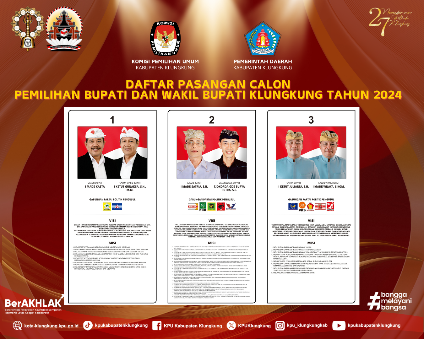 Kegiatan ini dibuka oleh Ketua KPU Provinsi Bali, I Dewa Agung Gede Lidartawan. Kegiatan ini dihadiri oleh Anggota KPU Provinsi Bali Divisi Teknis Penyelenggara, Luh Putu Sri Widyastini, Divisi Hukum dan Pengawasan, Anak Agung Gede Raka Nakula, Divisi Sosdiklih Parmas dan SDM, I Gede John Darmawan, dan Sekretaris KPU Provinsi Bali, I Made Oka Purnama. Hadir dalam kegiatan ini Ketua KPU Kabupaten Klungkung, I Ketut Sudiana menyampaikan terkait kesiapan Pilkada Serentak di Kabupaten Klungkung, dan dihadiri Divisi Sosdiklih Parmas dan SDM, Luh Putu Inten Pradnyani. Kegiatan ini diikuti oleh Forkompinda Provinsi Bali serta Bawaslu Provinsi Bali, Forkompinda Kabupaten Klungkung beserta Bawaslu Kabupaten Klungkung menyampaikan kesiapan Pemerintah dan Stakeholder terkait dalam dukungan pelaksanaan Pilkada Serentak Tahun 2024 Pemilihan Gubernur dan Wakil Gubernur Bali serta Bupati dan Wakil Bupati Klungkung Tahun 2024, dan dihadiri Media se-Bali.
