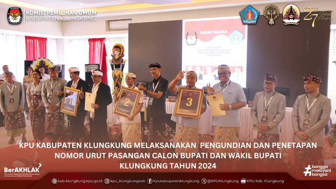 Kegiatan ini dibuka sekaligus dipimpin oleh Ketua KPU Kabupaten Klungkung, I Ketut Sudiana, Divisi Perencanaan Data dan Informasi, Made Dwi Adnyana Putra, Divisi Hukum dan Pengawasan, I Komang Artawan serta arahan dari Divisi Teknis Penyelenggaraan, I Gede Suka Astreawan, dan Divisi Sosdiklih Parmas dan SDM, Luh Putu Inten Pradnyani. Pembacaan Naskah Deklarasi dilakukan oleh Pasangan Calon Nomor Urut 1 adalah I Made Kasta dan I Ketut Gunaksa, Nomor Urut 2 adalah I Made Satria dan Tjokorda Gde Surya Putra, serta Nomor Urut 3 adalah I Ketut Juliarta dan I Made WIjaya. Selanjutnya dilaksanakan Pembacaan Doa Bersama yang dipimpin oleh FKUB Kabupaten Klungkung serta Penandatanganan Deklarasi Pilkada Damai Pemilihan Bupati dan Wakil Bupati Klungkung Tahun 2024 oleh Pasangan Calon dan Tim Kampanye Pasangan Calon, Pj. Bupati Klungkung, Kapolres Klungkung, Dandim 1610, Kepala Kejaksaan Negeri Kabupaten Klungkung, Ketua Pengadilan Negeri Semarapura, Ketua dan Anggota KPU Kabupaten Klungkung serta Ketua Bawaslu Kabupaten Klungkung. Kegiatan i juga dihadiri oleh Ida Dalem Semarapura, Bappeda Kabupaten Klungkung, Kesbangpol Kabupaten Klungkung, Dinas Kesehatan Kabupaten Klungkung, Tim Pokja Pencalonan, serta Ketua dan Anggota PPK se-Kabupaten Klungkung.