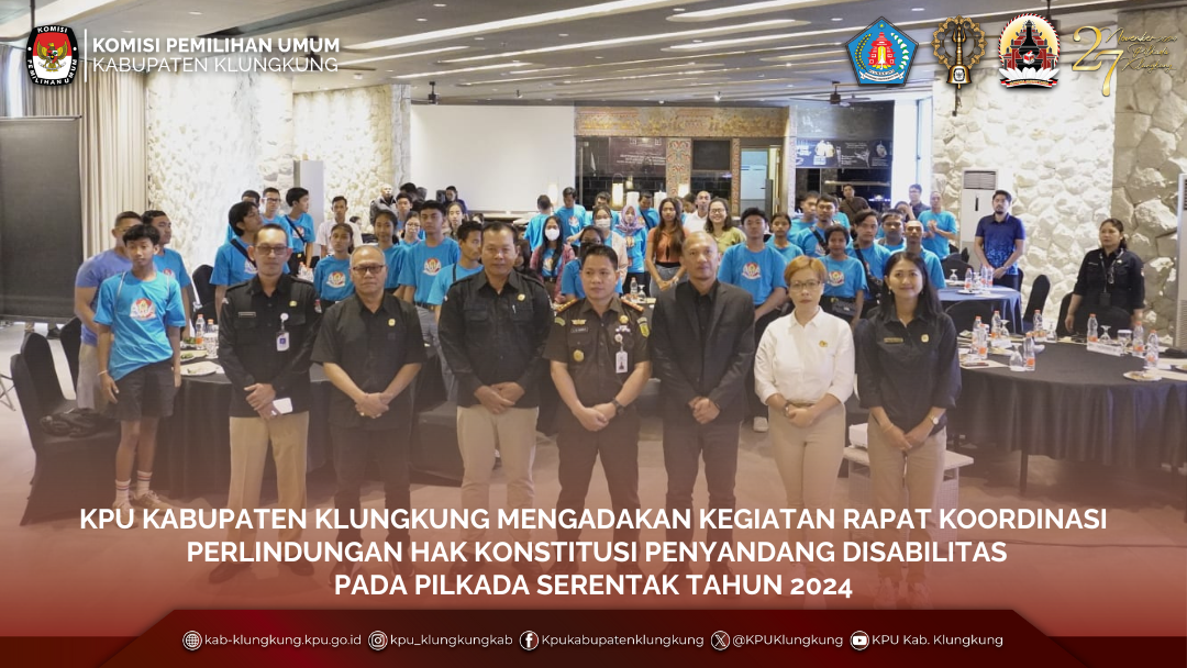 Rapat Koordinasi Perlindungan Hak Konstitusi Penyandang Disabilitas pada Pemilihan Gubernur dan Wakil Gubernur Bali, Bupati dan Wakil Bupati Klungkung Tahun 2024 dibuka oleh Ketua KPU Kabupaten Klungkung, I Ketut Sudiana dilanjutkan dengan Sambutan KPU Provinsi Bali yang dihadiri oleh Ketua Divisi Sosialisasi, Pendidikan Pemilih, Partisipasi Masyarakat dan SDM, I Gede John Darmawan. Pengarahan juga disampaikan Komisioner KPU Kabupaten Klungkung, I Komang Artawan Divisi Hukum dan Pengawasan, Luh Putu Inten Pradnyani Divisi Sosialisasi, Pendidikan Pemilih, Partisipasi Masyarakat dan SDM KPU Kabupaten Klungkung. Narasumber dihadirkan dari Kejaksaan Negeri Klungkung untuk mengisi acara rapat koordinasi tersebut.