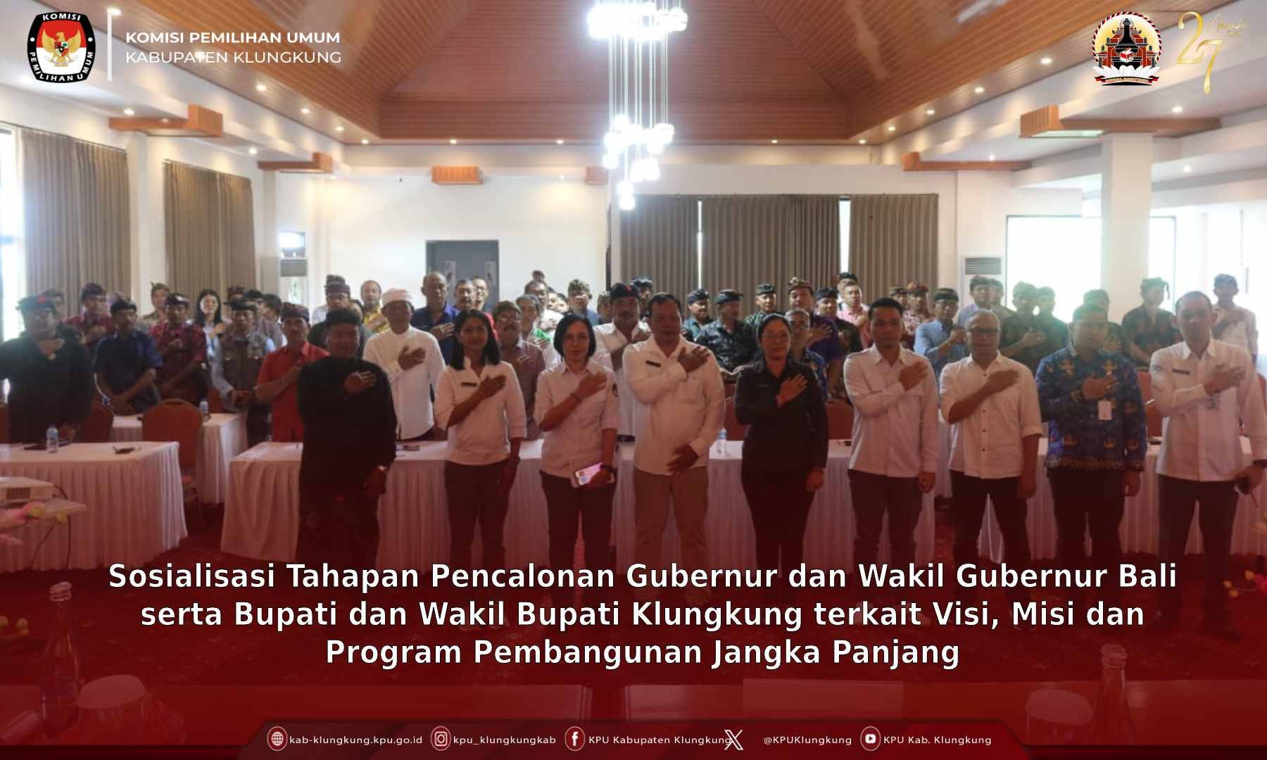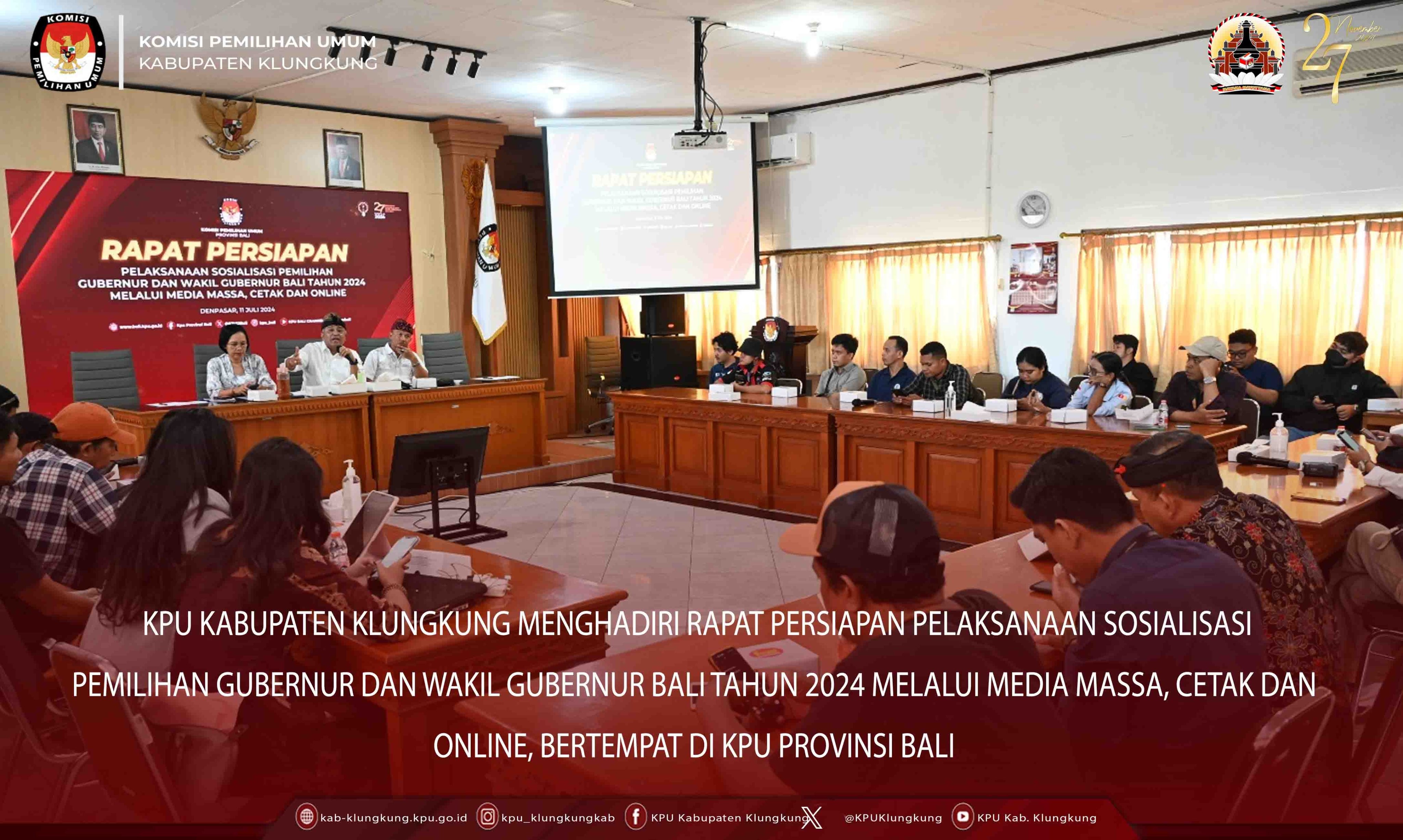 Rapat Persiapan Pelaksanaan Sosialisasi Pemilihan Gubernur dan Wakil Gubernur Bali Tahun 2024 dibuka oleh Ketua KPU Provinsi Bali I Dewa Agung Gede Lidartawan, Pengarahan juga disampaikan Anggota KPU Provinsi Bali I Gede John Darmawan dari divisi Sosialisasi, Pendidikan Pemilih, Partisipasi Masyarakat dan SDM dan turut mendampingi Luh Putu Sri Widyastini Anggota KPU Provinsi Bali divisi Teknis Penyelenggaraan. Dalam kegiatan tersebut masing-masing KPU Kabupaten/Kota menyampaikan rencana kerja sosialisasi melalui media massa, Cetak dan Online yang akan dilaksanakan di wilayah kerjanya.