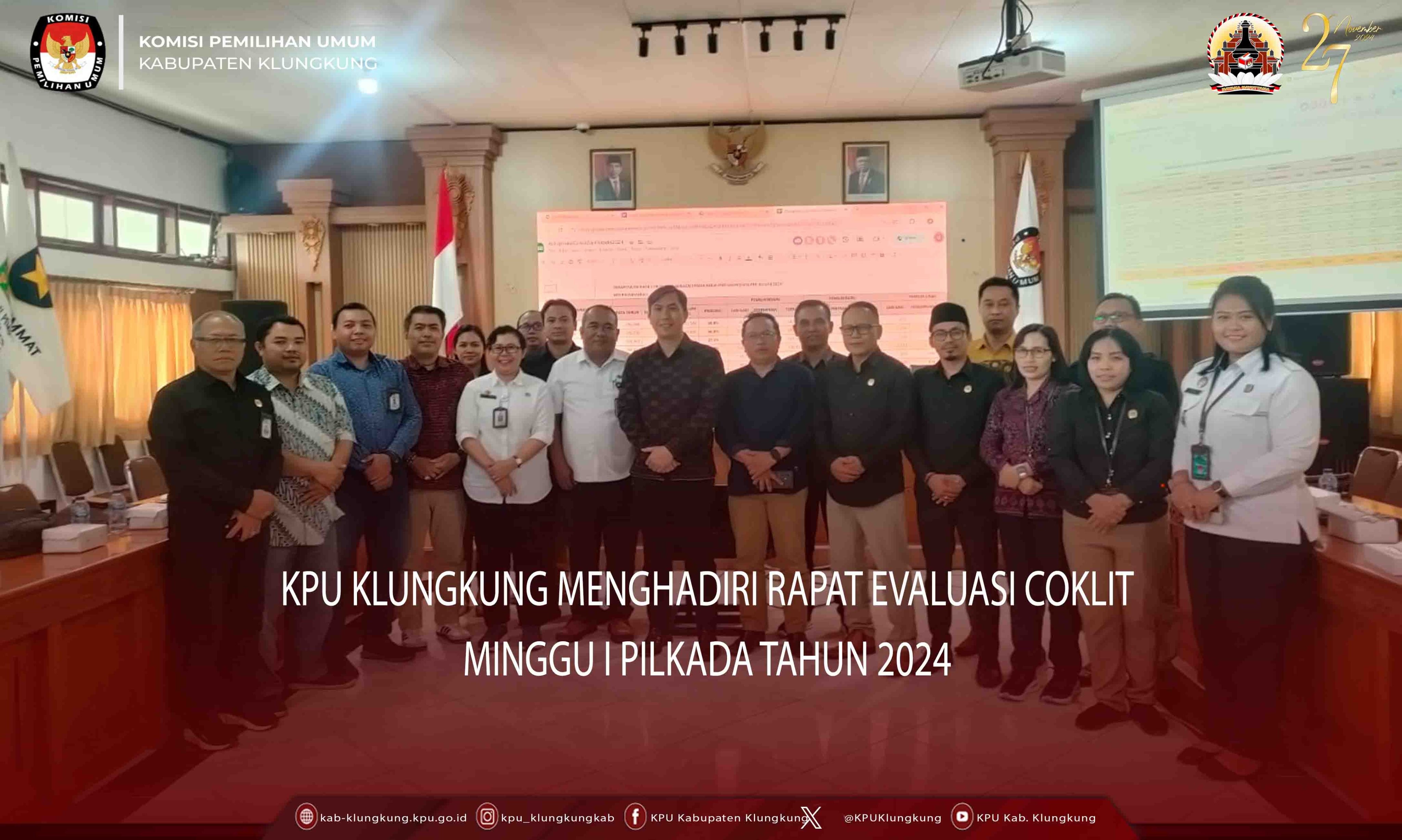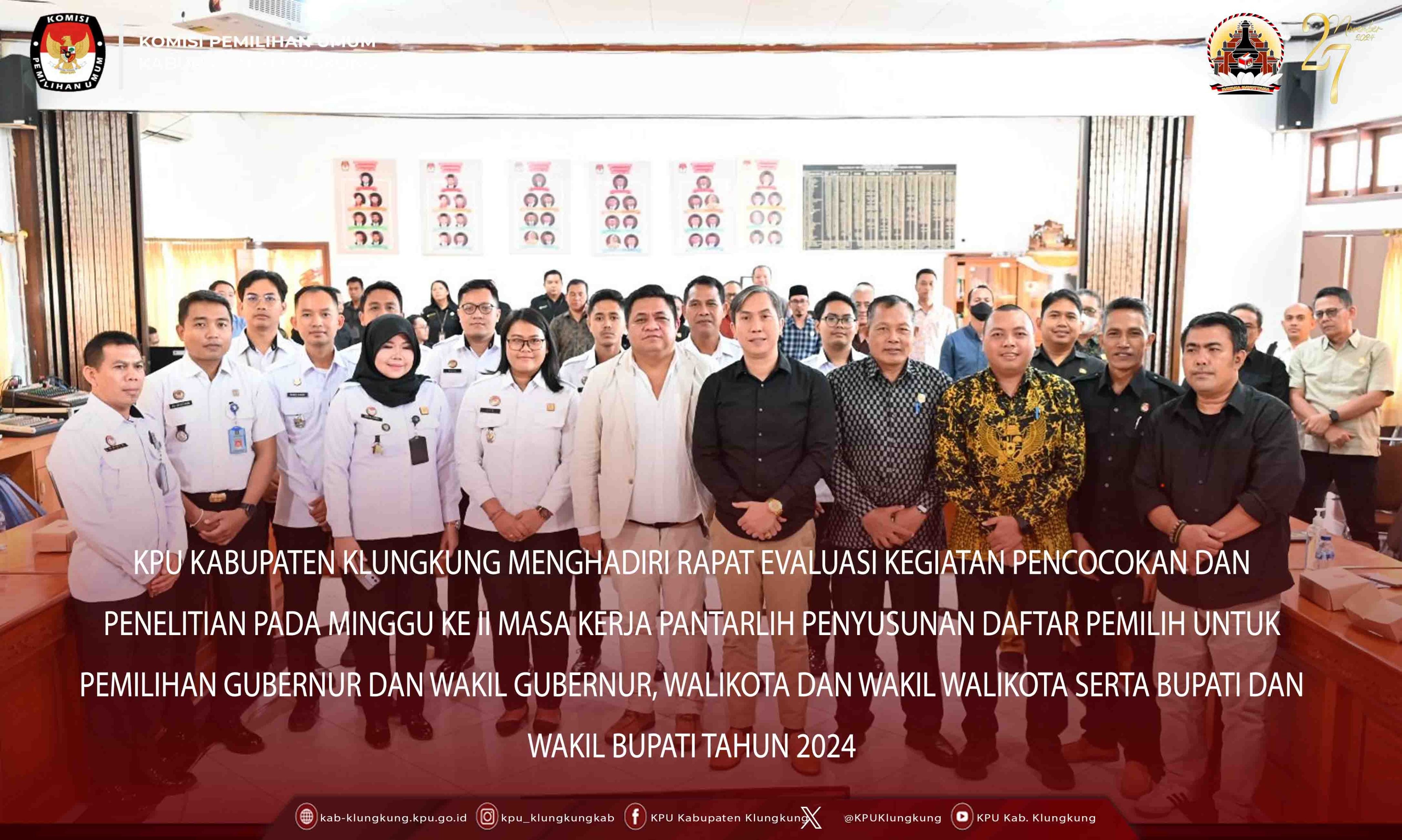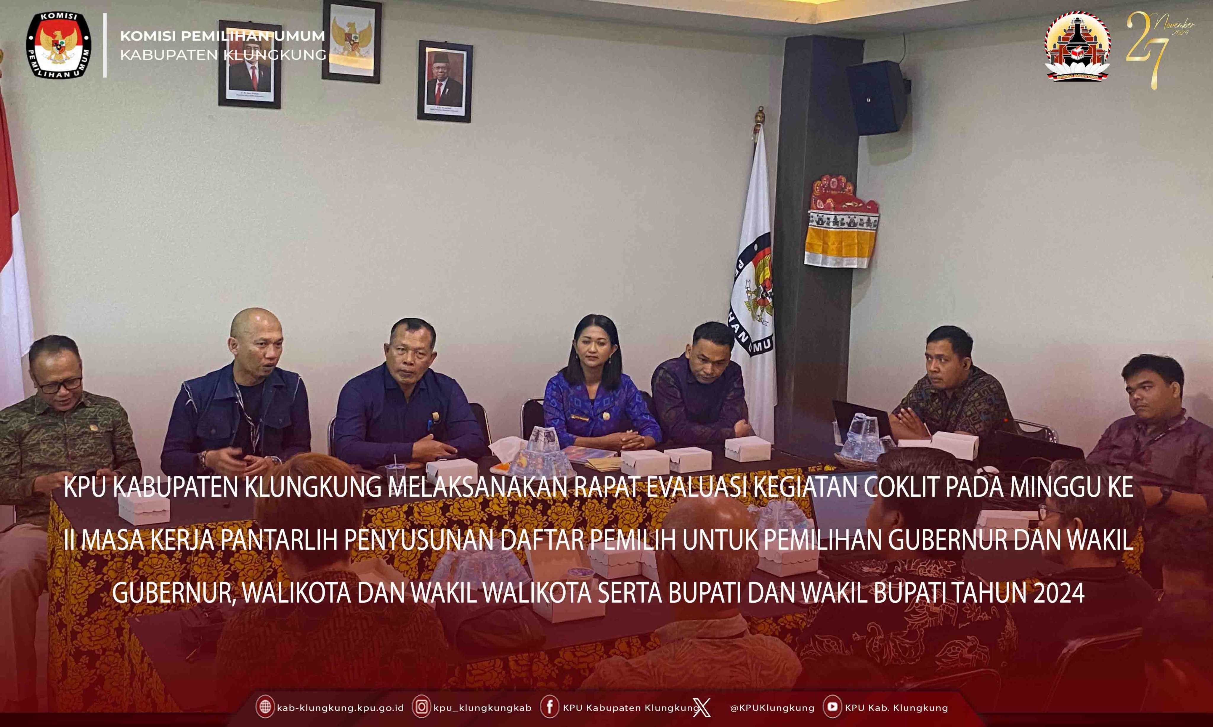 #TemanPemilih, KPU Kabupaten Klungkung melaksanakan Rapat Evaluasi Kegiatan Coklit pada Minggu ke II Masa Kerja Pantarlih Penyusunan Daftar Pemilih untuk Pemilihan Gubernur dan Wakil Gubernur, Walikota dan Wakil Walikota serta Bupati dan Wakil Bupati Tahun 2024, Selasa, 9 Juli 2024. Rapat Evaluasi dibuka oleh Ketua KPU Kabupaten Klungkung, I Ketut Sudiana. Pengarahan terkait Evaluasi Kegiatan Coklit pada Minggu ke II juga disampaikan oleh Anggota KPU Kabupaten Klungkung Divisi Perencanaan Data dan Informasi, Made Dwi Adnyana Putra, I Komang Artawan dari Divisi Hukum dan Pengawasan, I Gede Suka Astreawan dari Divisi Teknis Penyelenggaraan, dan Luh Putu Inten Pradnyani dari Divisi Sosialisasi, Pendidikan Pemilih, Partisipasi Masyarakat dan SDM. Dalam kegiatan tersebut masing-masing PPK di wilayah Kabupaten Klungkung menyampaikan progres coklit oleh pantarlih yang telah dilaksanakan di wilayah kerjanya. Rapat Evaluasi tersebut juga dihadiri Anggota KPU Provinsi Bali I Gede John Darmawan beserta Kasubbag Data Provinsi Bali untuk memonitoring pelaksanaan Evaluasi Coklit pada Minggu ke II masa kerja Pantarlih di Wilayah Kabupaten Klungkung serta memberikan arahan kepada PPK di wilayah Kabupaten Klungkung, dan dihadiri pula oleh Bawaslu Kabupaten Klungkung. #KPUMelayani #PilkadaSerentak2024