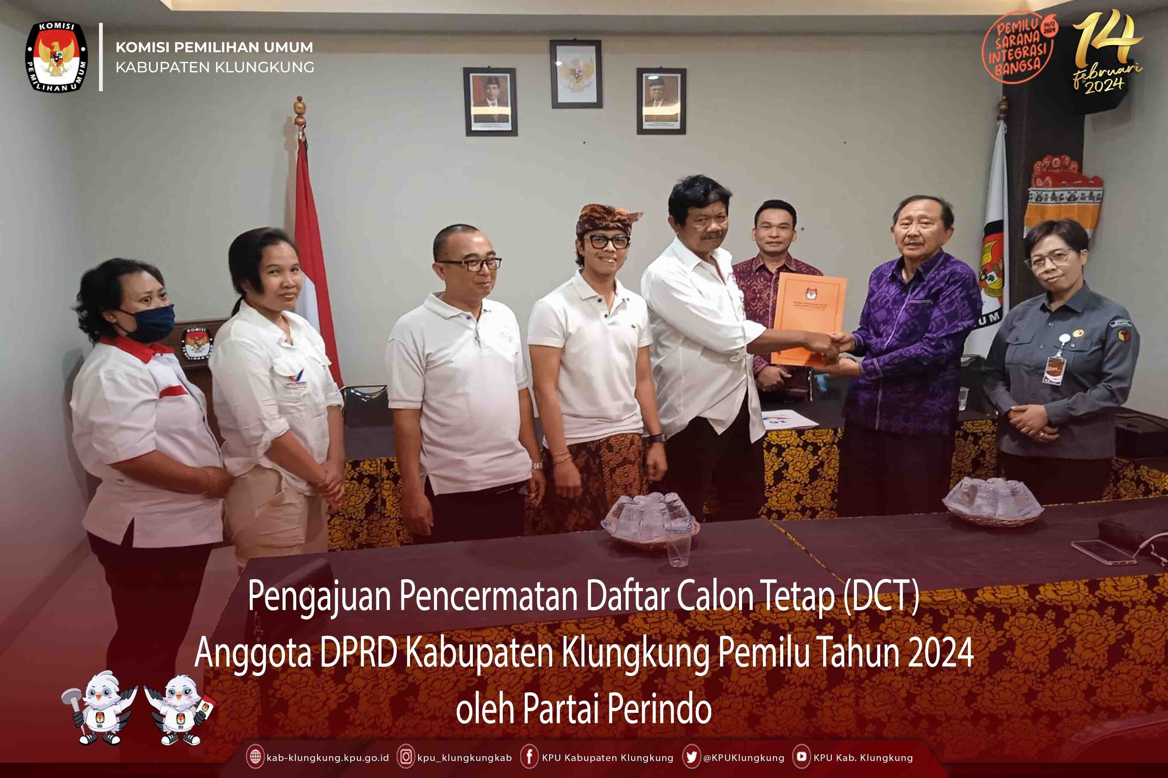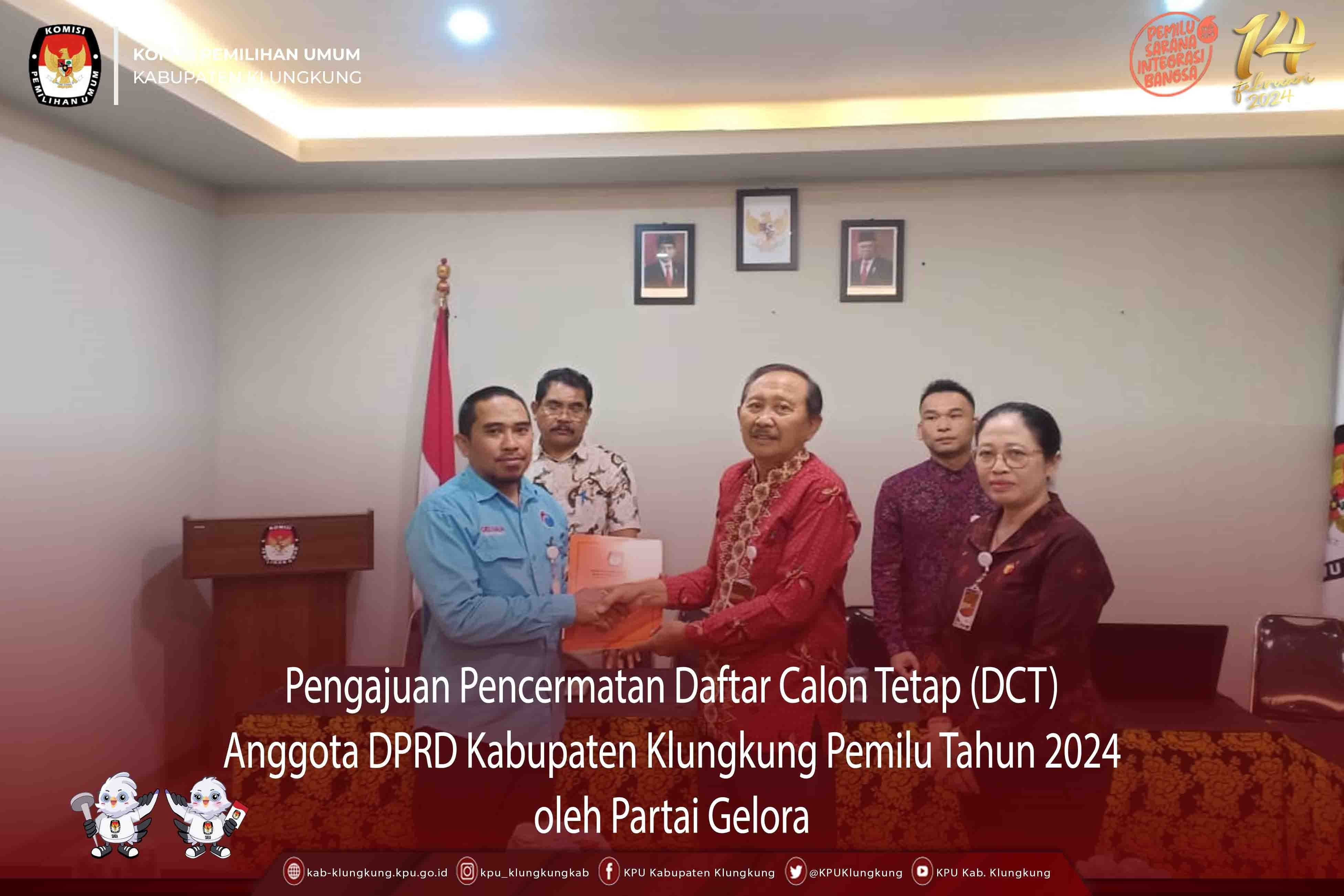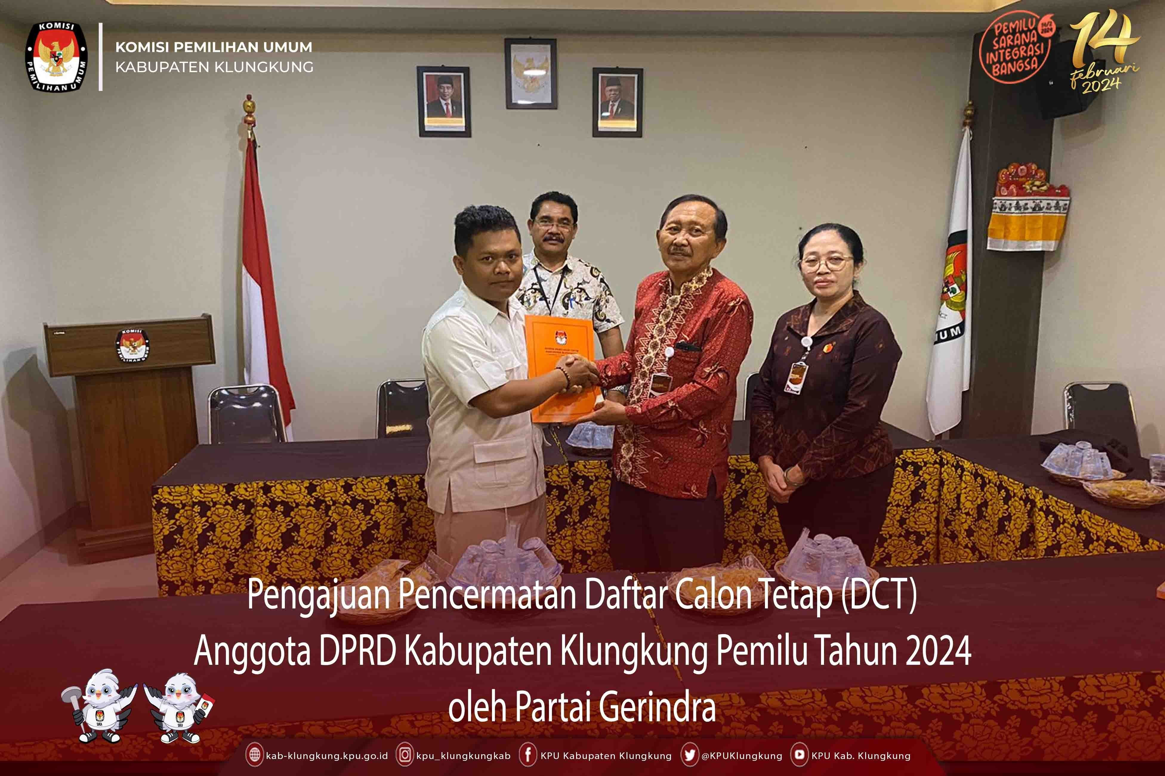 Kedatangan Partai GERINDRA diterima oleh Ketua, I Gusti Lanang Mega Sakara bersama Anggota, I Gede Suka Astreawan, beserta seluruh jajaran kesekretaritan KPU Kabupaten Klungkung. Hasil pemeriksaan berkas pengajuan bersama Bawaslu Kabupaten Klungkung, semua berkas dinyatakan lengkap dan status diterima. Kegiatan diakhiri dengan penyerahan Tanda Terima Pengajuan Pencermatan DCT Anggota DPRD Kabupaten Klungkung Pemilu Tahun 2024.