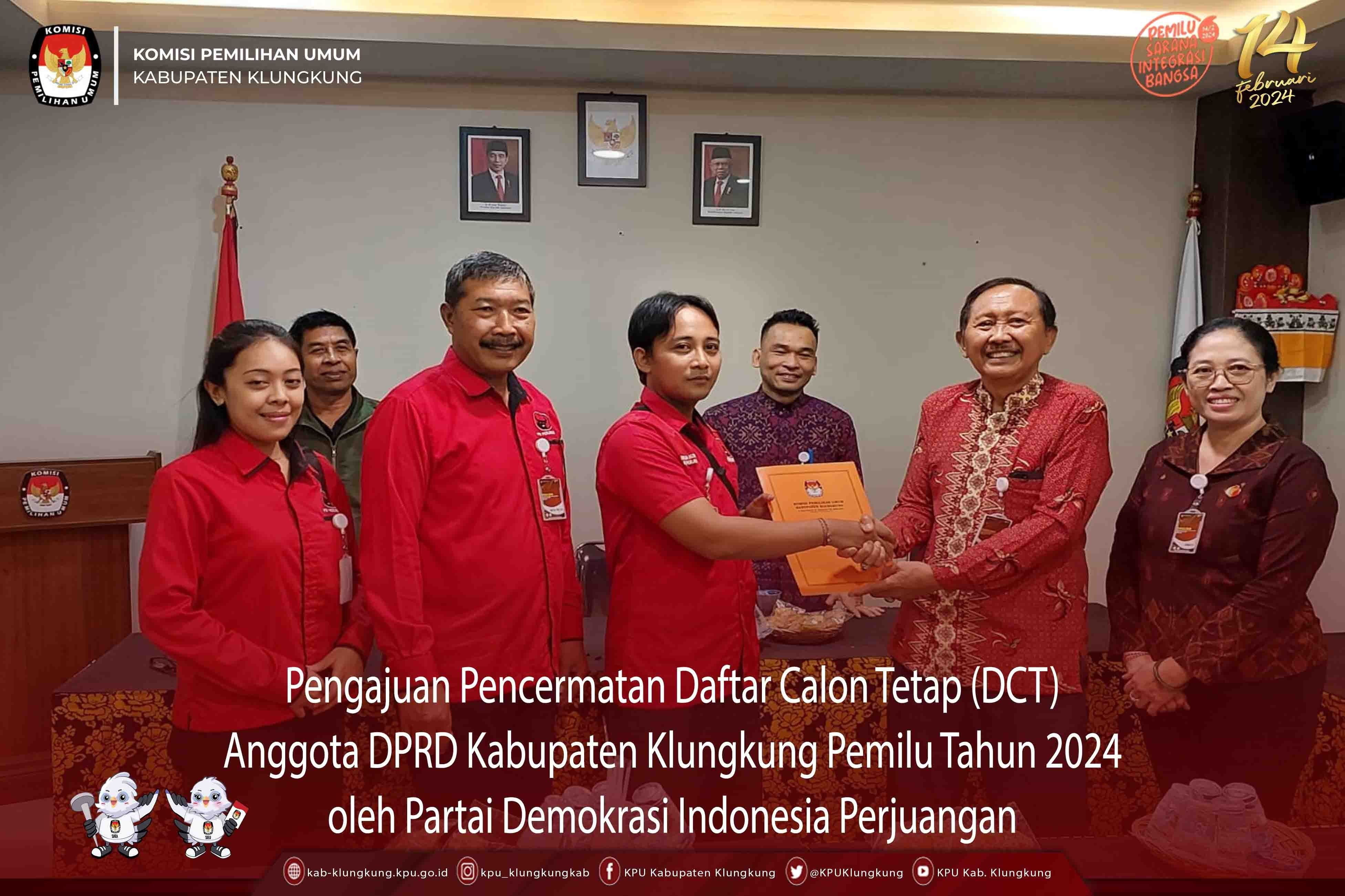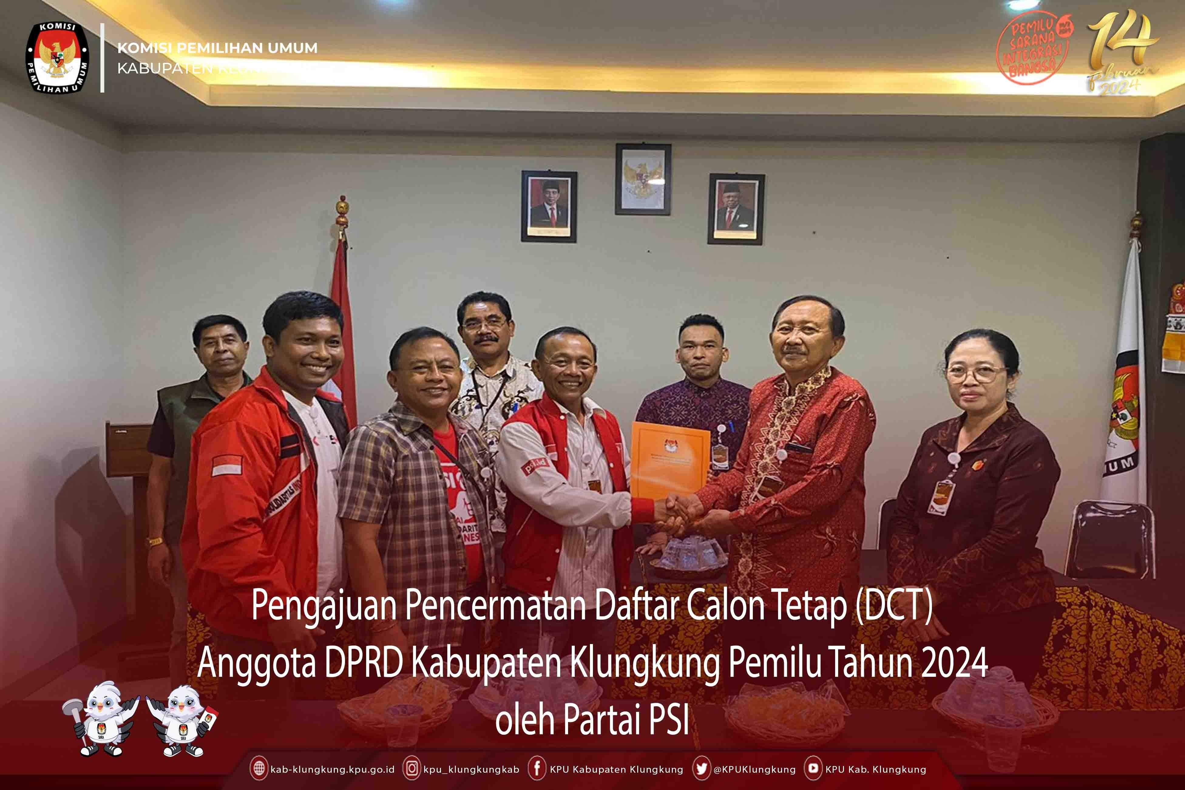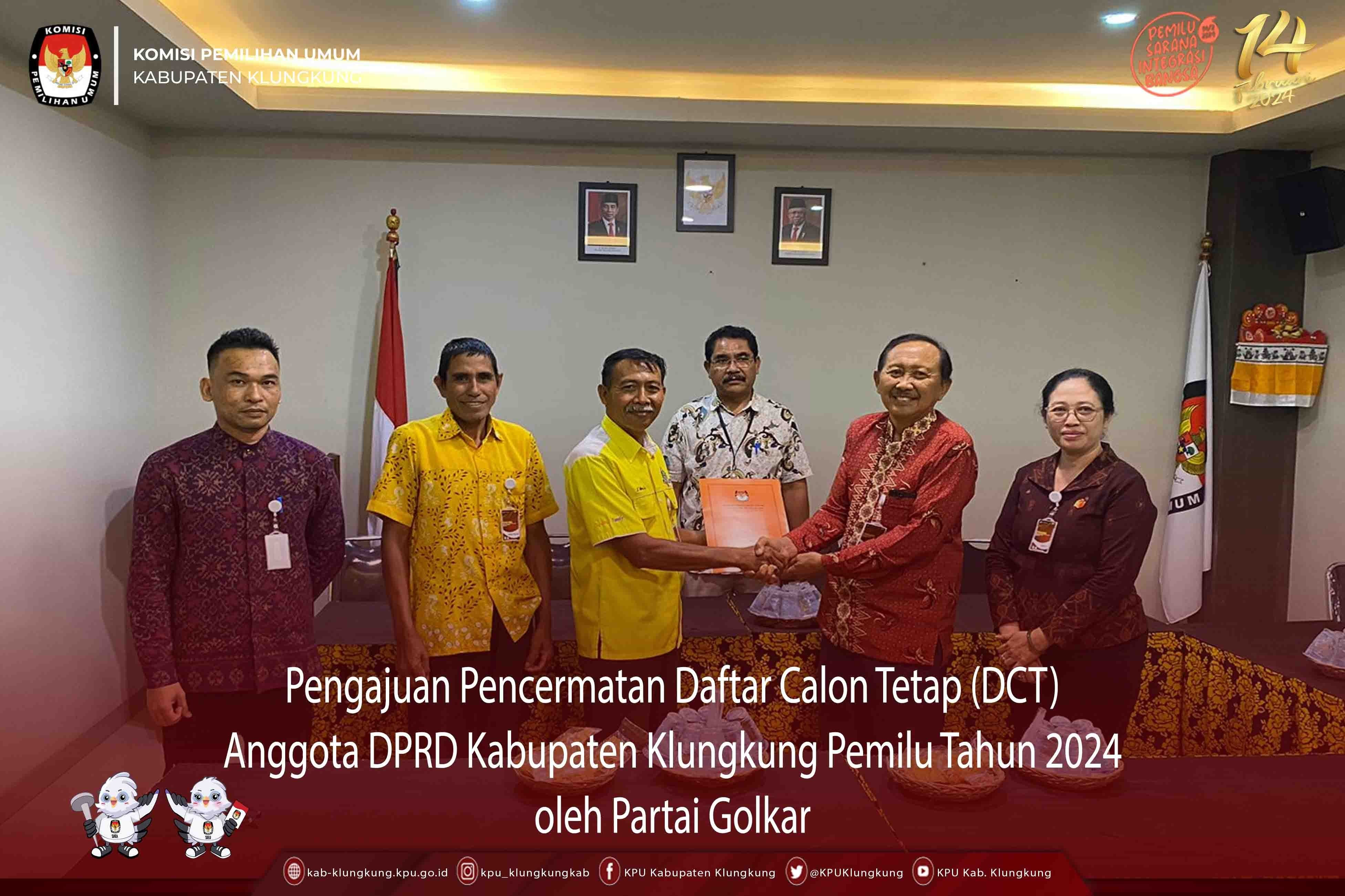 Kedatangan Partai GERINDRA diterima oleh Ketua, I Gusti Lanang Mega Sakara bersama Anggota, I Gede Suka Astreawan, beserta seluruh jajaran kesekretaritan KPU Kabupaten Klungkung. Hasil pemeriksaan berkas pengajuan bersama Bawaslu Kabupaten Klungkung, semua berkas dinyatakan lengkap dan status diterima. Kegiatan diakhiri dengan penyerahan Tanda Terima Pengajuan Pencermatan DCT Anggota DPRD Kabupaten Klungkung Pemilu Tahun 2024.