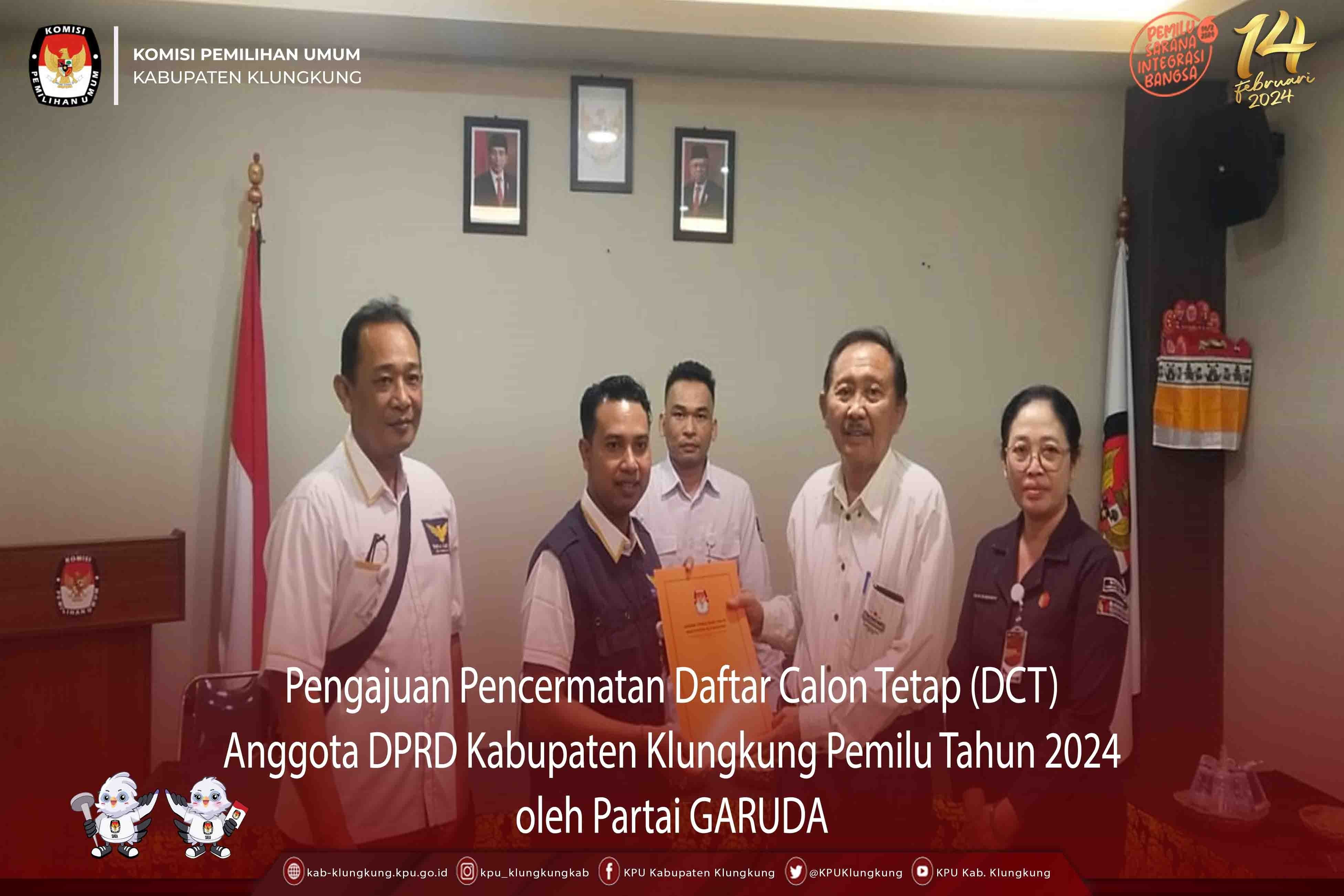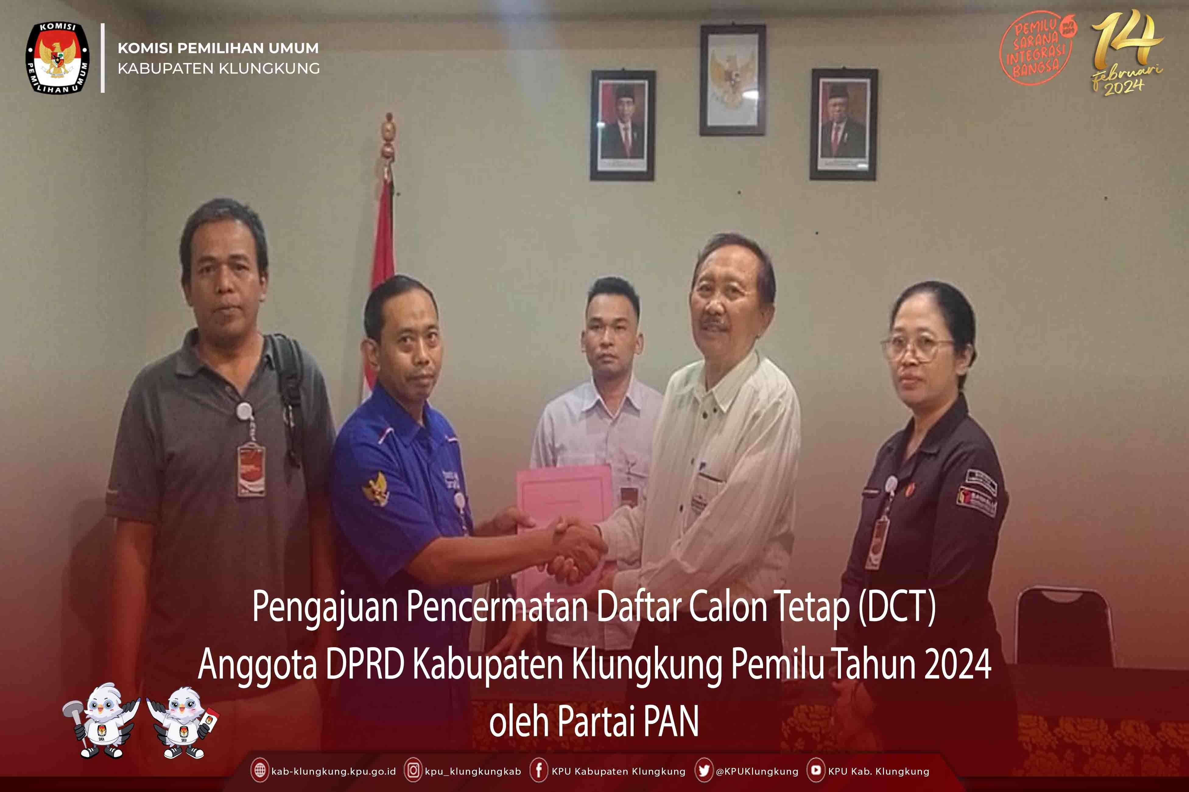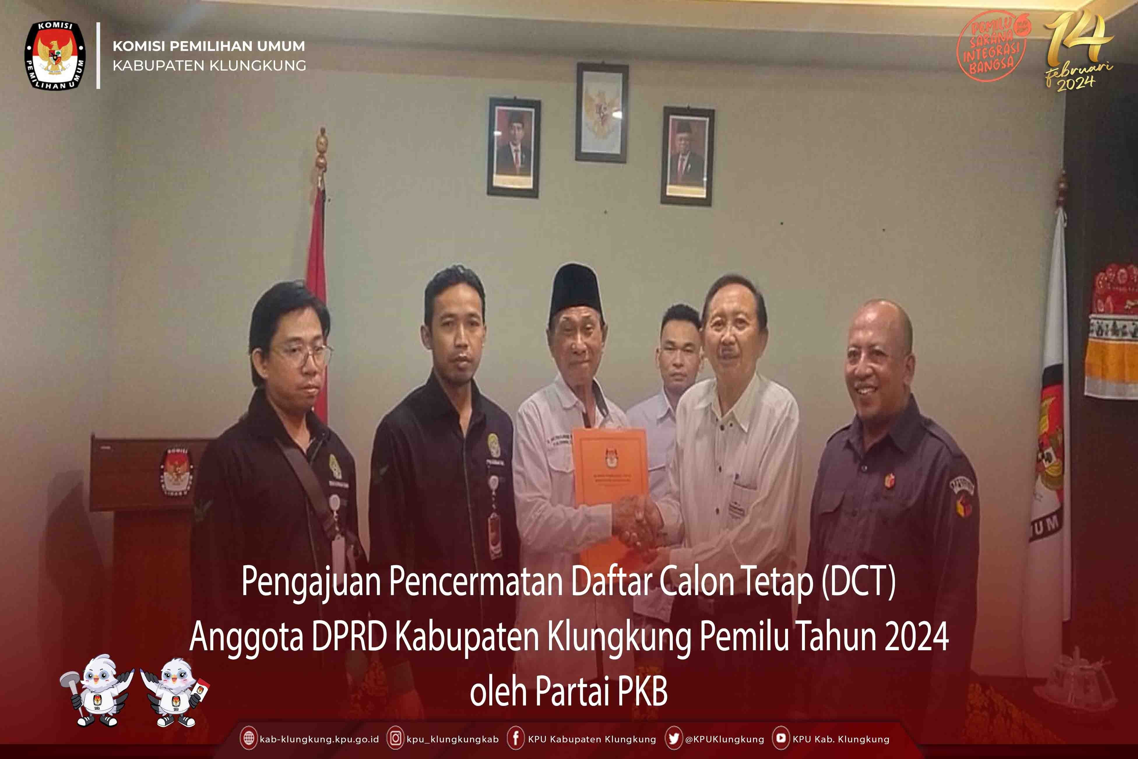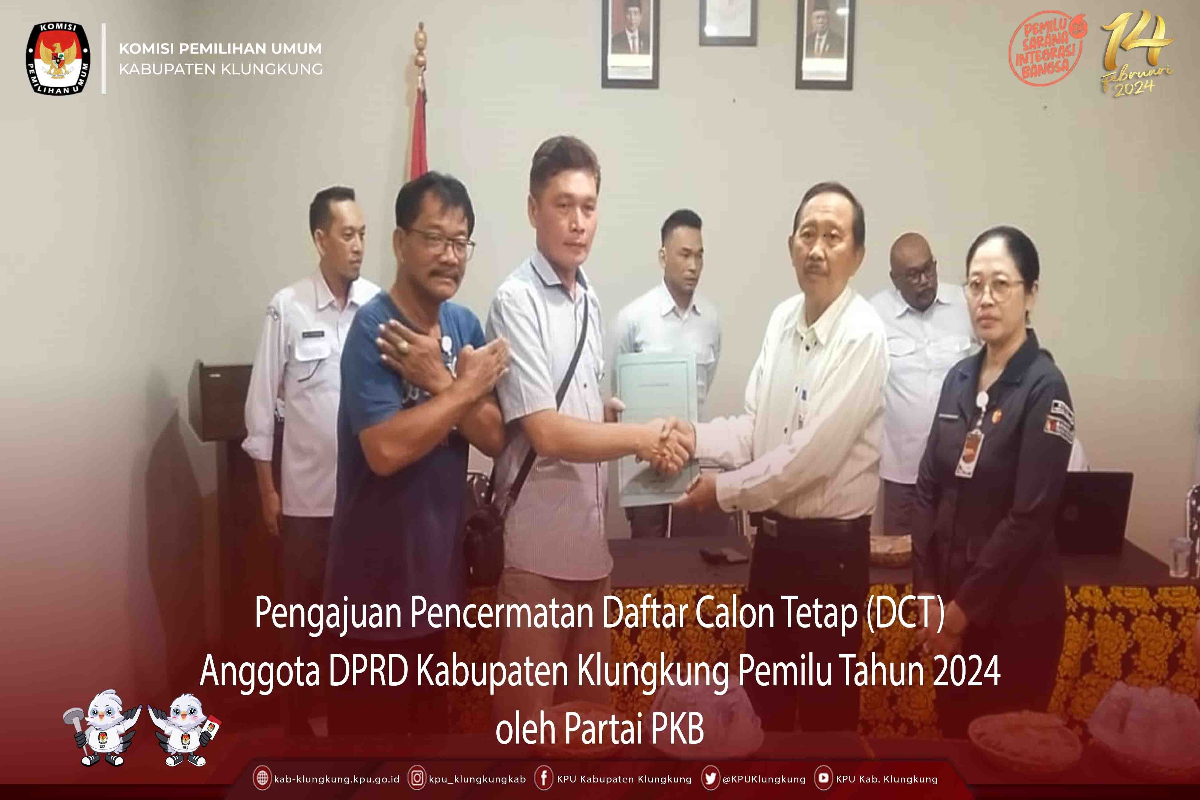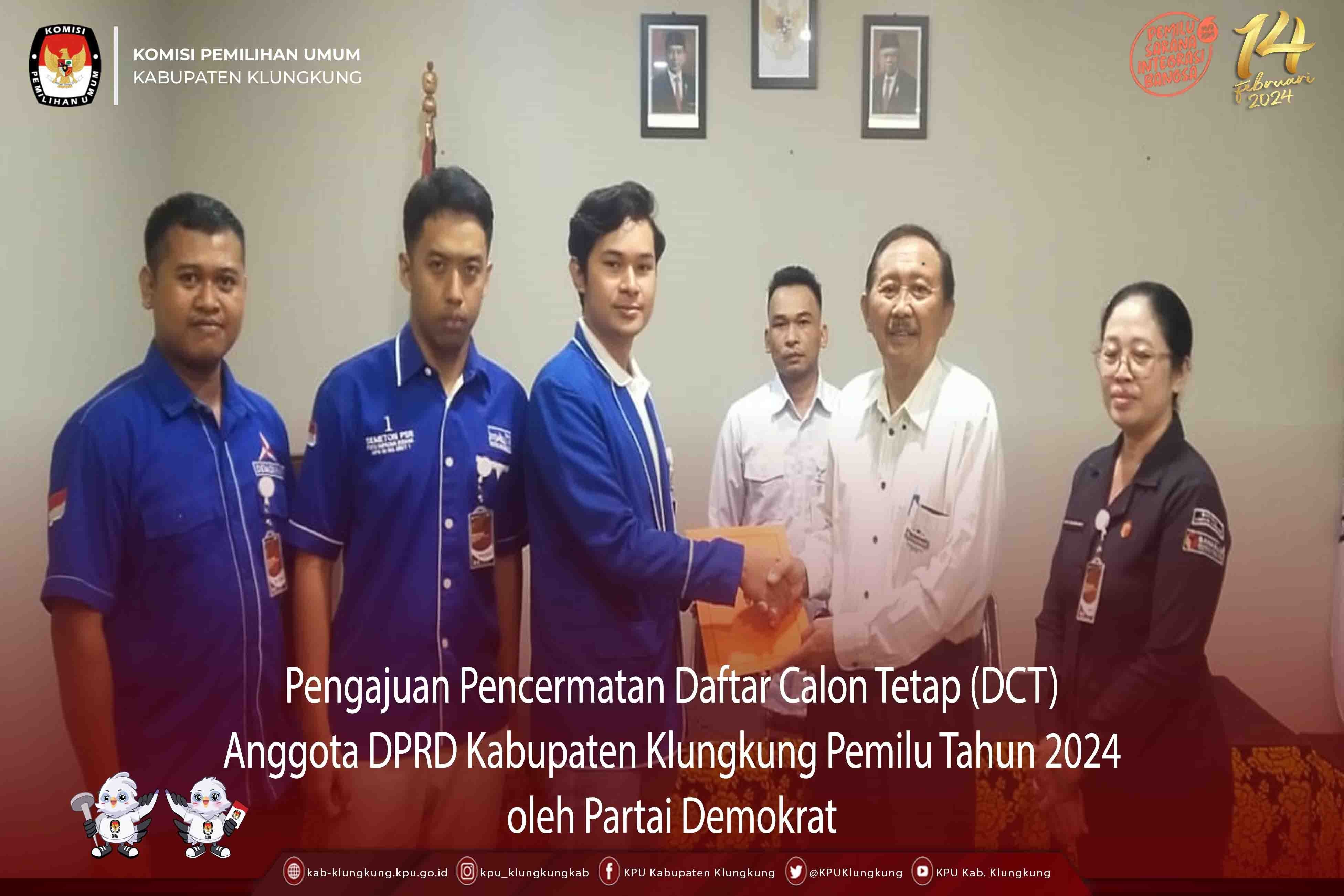 Kedatangan Partai DEMOKRAT diterima oleh Ketua, I Gusti Lanang Mega Sakara bersama Anggota, I Gede Suka Astreawan, beserta seluruh jajaran kesekretaritan KPU Kabupaten Klungkung. Hasil pemeriksaan berkas pengajuan bersama Bawaslu Kabupaten Klungkung, semua berkas dinyatakan lengkap dan status diterima. Kegiatan diakhiri dengan penyerahan Tanda Terima Pengajuan Pencermatan DCT Anggota DPRD Kabupaten Klungkung Pemilu Tahun 2024.