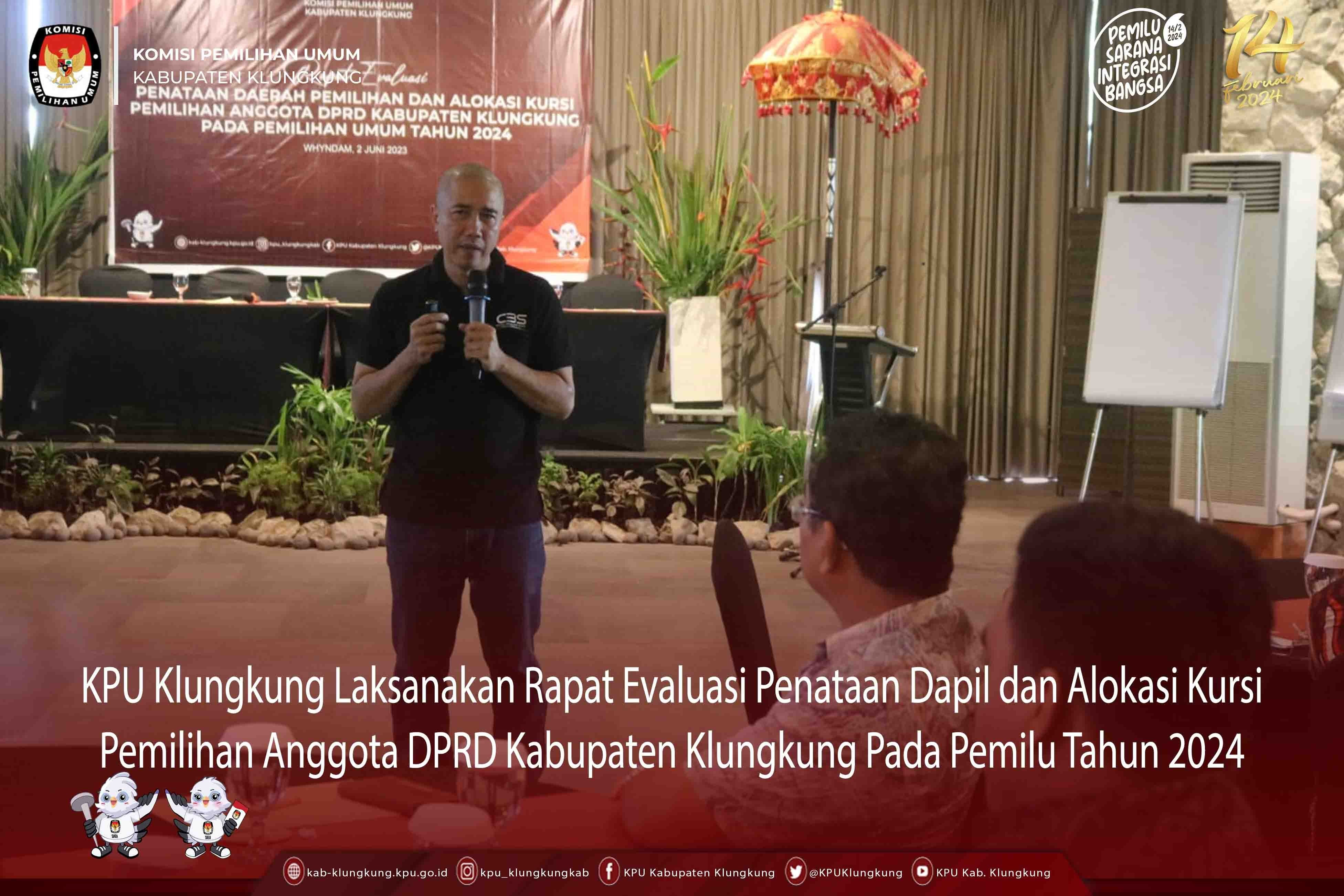 #TemanPemilih, KPU Klungkung Laksanakan Rapat Evaluasi Penataan Dapil dan Alokasi Kursi Pemilihan Anggota DPRD Kabupaten Klungkung Pada Pemilu Tahun 2024, jumat (2/6/2023) di Wyndham. Kegiatan rapat evaluasi dibuka Ketua KPU Kabupaten Klungkung I Gusti Lanang Mega Saskara yang menyampaikan maksud dan tujuan dari penyelenggaraan rapat evaluasi. Dilanjutkan dengan pemaparan materi dan evaluasi yang menghadirkan narasumber I Ketut Udi Prayudi.