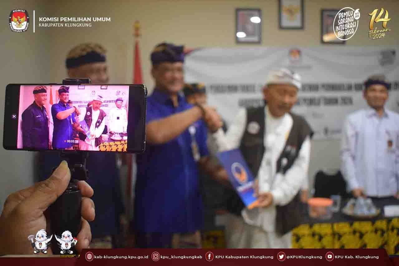 Delegasi partai diterima oleh Ketua KPU Kabupaten Klungkung I Gusti Lanang Mega Saskara bersama Anggota Ida Bagus Nyoman Barwata, Sang Ayu Mudiasih, I Gede Suka Astreawan, I Wayan Sumerta dan jajaran Sekretariat serta disaksikan oleh Bawaslu, di Ruang Rapat KPU Kabupaten Klungkung.