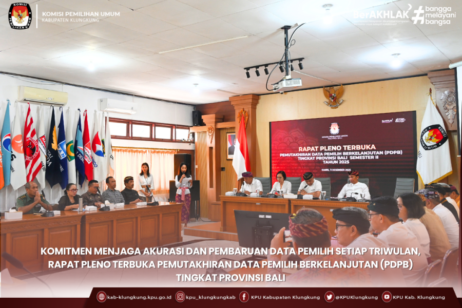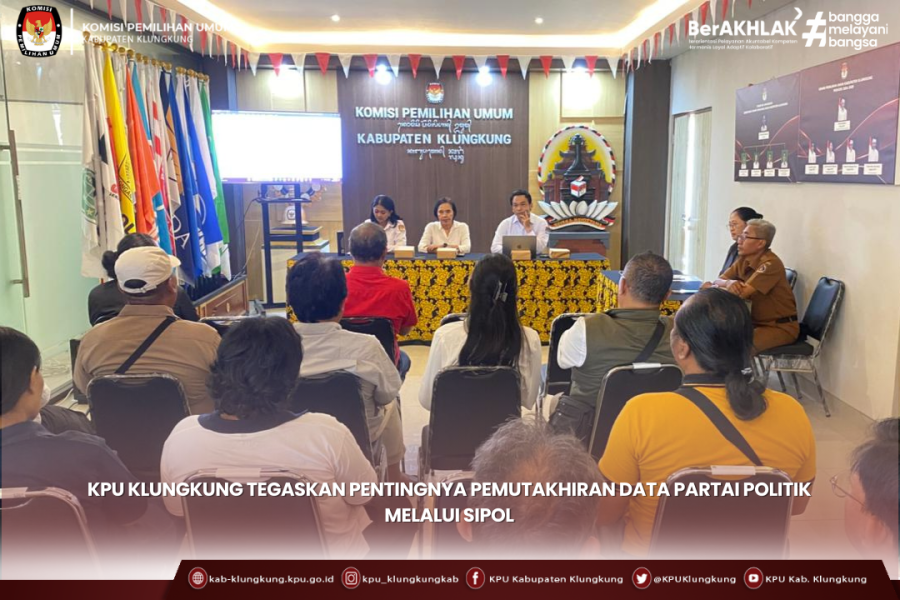 #TemanPemilih, KPU Klungkung Tegaskan Pentingnya Pemutakhiran Data Partai Politik melalui SIPOL yang disampaikan pada kegiatan Rapat Koordinasi Pemutakhiran Data Partai Politik Semester II Tahun 2025, bertempat di Kantor KPU Kabupaten Klungkung, Senin (15/12/2025) Pemutakhiran data Partai Politik penting untuk menjaga akurasi dan validitas data kepemiluan. KPU Klungkung mendorong peran aktif Partai Politik dalam memperbarui data kepengurusan dan kelembagaan, serta memperkuat koordinasi agar data tetap mutakhir dan sesuai ketentuan. Hal ini disampaikan oleh Ketua DIvisi Sosdiklih, Parmas dan SDM, Luh Putu Inten Pradnyani sekaligus membuka acara. Anggota KPU Provinsi Bali, Luh Putu Sri WIdyastini mengimbau Partai Politik untuk segera melakukan pembaruan data apabila terdapat perubahan keanggotaan, alamat kantor, maupun kepengurusan. Proses unggah data dilaksanakan pada Kamis–Jumat, 18–19 Desember 2025. Berita Acara pemutakhiran data akan diterbitkan pada Januari 2025. Menyarankan agar KPU Klungkung membuka layanan helpdesk dan siap memberikan pendampingan serta informasi terkait pemutakhiran data SIPOL secara berkelanjutan. Ketua Divisi Teknis Penyelenggara, I Gede Suka Astreawan menyampaikan Pemutakhiran data SIPOL berkelanjutan berlandaskan Surat Dinas Nomor 1983 sebagai langkah strategis dalam menjaga keakuratan data dan meningkatkan ketertiban administrasi kepartaian. Melalui kegiatan sosialisasi ini, KPU Klungkung mengajak seluruh Partai Politik untuk memahami peran SIPOL sebagai sarana pengelolaan data yang transparan, akuntabel, dan mudah diakses, serta mengikuti pemutakhiran data sesuai arahan yang berlaku. Kegiatan ini dihadiri oleh Bawaslu Kabupaten Klungkung, Kesbangpool Kabupaten Klungkung, dan Partai Politik se-Kabupaten Klungkung. Kegiatan ditutup dengan mensosialisasikan Aplikasi SIPOL oleh Operator. #KPUMelayani