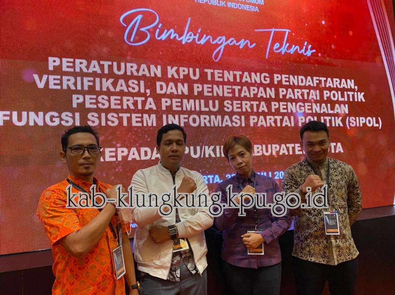 #TemanPemilih, Anggota KPU Kabupaten Klungkung Sang Ayu Mudiasih dan I Gede Suka Astreawan bersama Kasubbag Teknis Penyelenggaraan Pemilu, Partisipasi dan Humas serta Staf mengikuti bimbingan teknis (bimtek) Peraturan KPU tentang Pendaftaran, Verifikasi, dan Penetapan Partai Politik Peserta Pemilu serta pengenalan fungsi Sipol (system informasi partai politik) di Hotel Grand Mercure Harmoni Jakarta yang diselenggarakan KPU RI dari tanggal 23 Juli sampai dengan 25 Juli 2022.