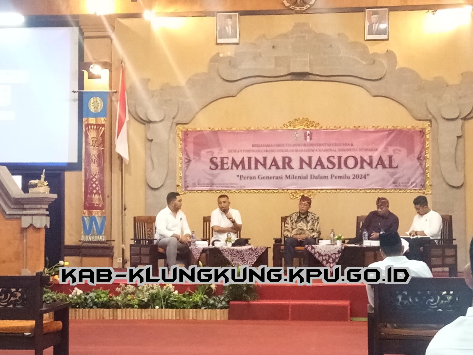 #TemanPemilih, Ketua KPU Kabupaten Klungkung I Gusti Lanang Mega Saskara bersama Anggota I Gede Suka Astreawan mengikuti seminar nasional dengan tema Peran Generasi Milenial dalam Pemilu 2024 yang diselenggarakan DPC GMNI (Gerakan Mahasiswa Nasional Indonesia) Denpasar, rabu (6/7) bertempat di Aula Fakultas Hukum Universitas Udayana.