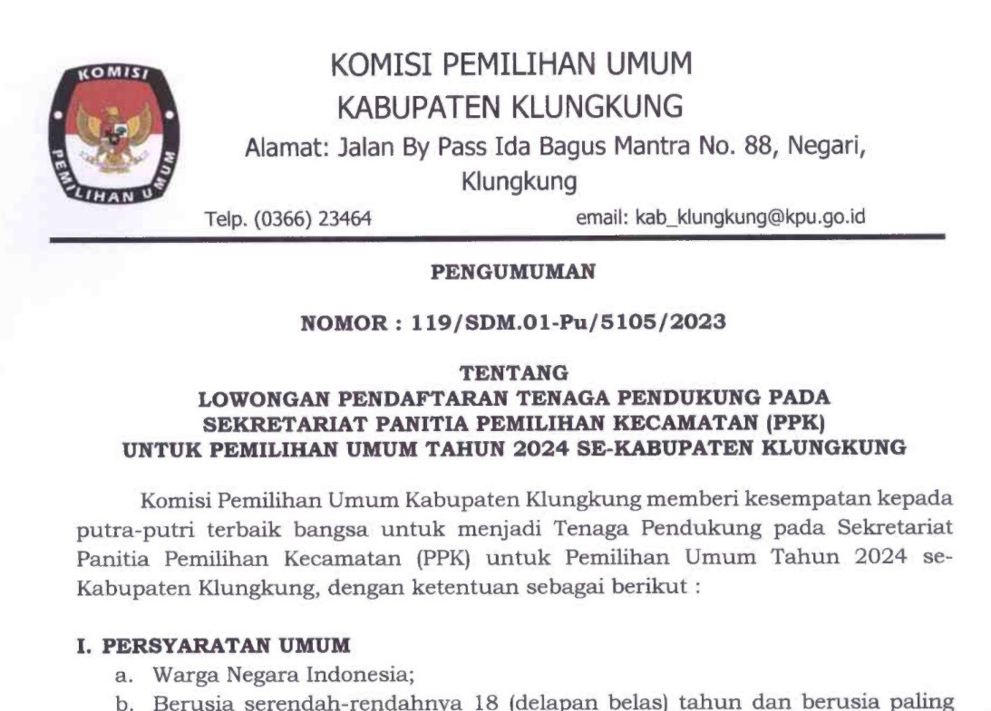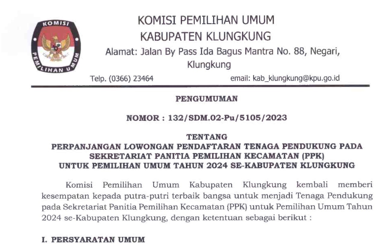 Pengumuman tentang perpanjangan lowongan pendaftaran tenaga pendukung pada sekretariat Panitia Pemilihan Kecamatan (PPK) untuk Pemilihan Umum Tahun 2024 se-Kabupaten Klungkung dapat dilihat disini