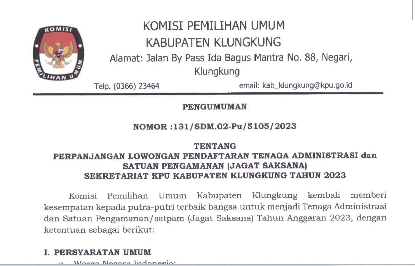 Pengumuman tentang perpanjangan lowongan pendaftaran tenaga administrasi dan satuan pengamanan (jagat saksana) sekretariat KPU Kabupaten Klungkung Tahun 2023 dapat dilihat disini
