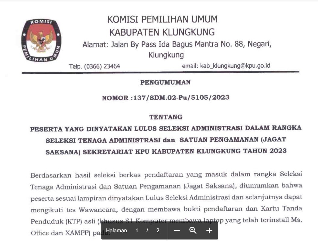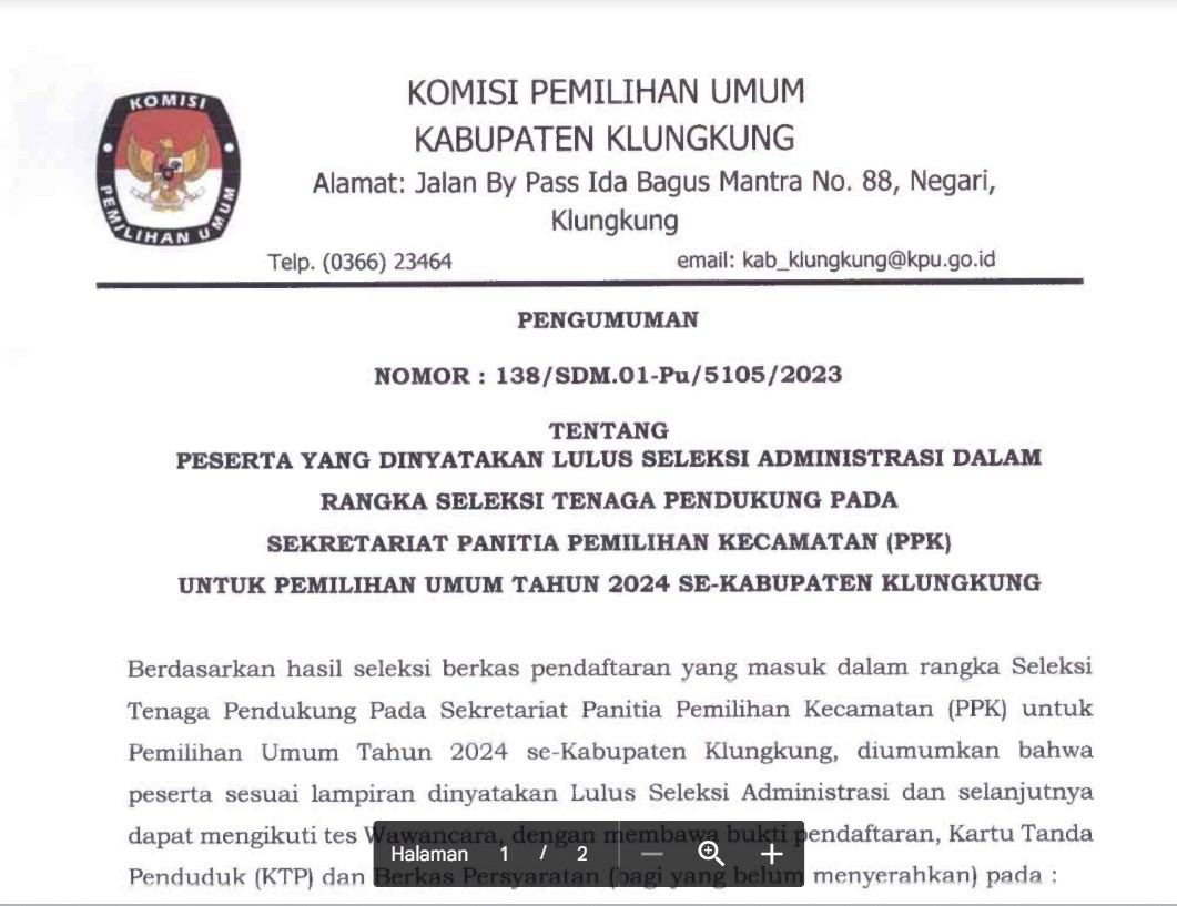 Pengumuman tentang Peserta yang dinyatakan lulus seleksi administrasi dalam rangka seleksi tenaga pendukung pada sekretariat Panitia Pemilihan Kecamatan (PPK) untuk Pemilihan Umum Tahun 2024 se-Kabupaten Klungkung dapat dilihat disini
