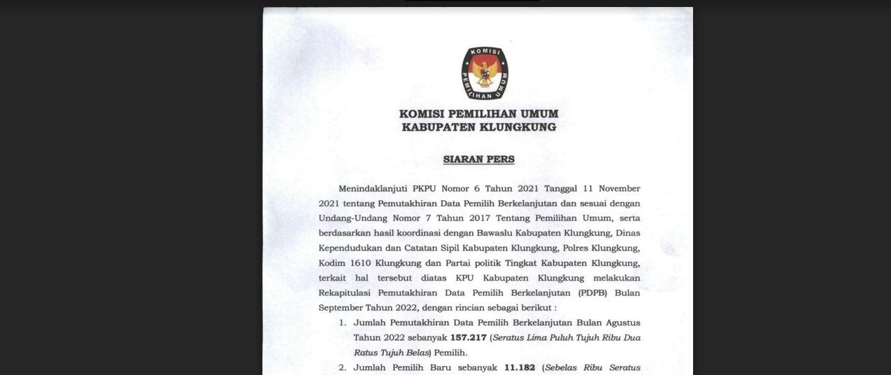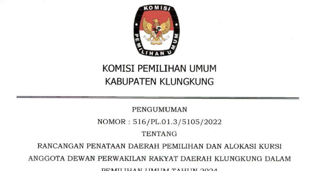Pengumuman tentang Rancangan Penataan Daerah Pemilihan dan Alokasi Kursi Anggota Dewan Perwakilan Rakyat Daerah Klungkung dalam Pemilihan Umum Tahun 2024 dapat diunduh disini