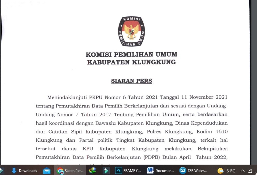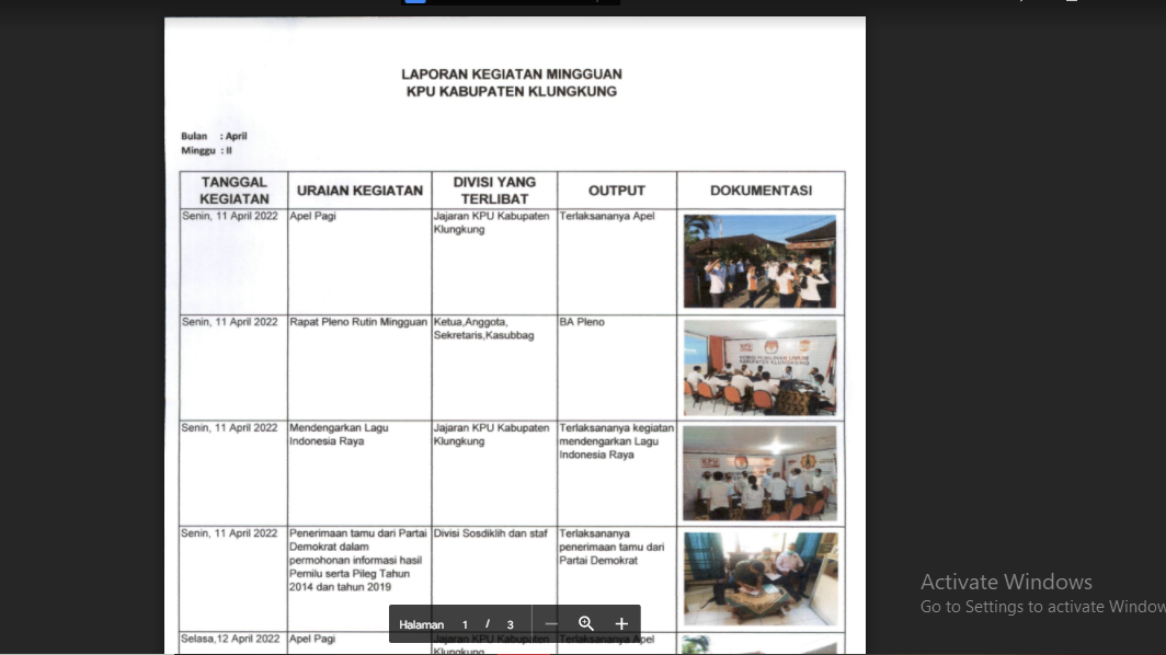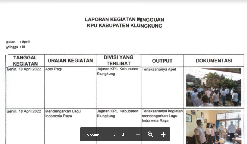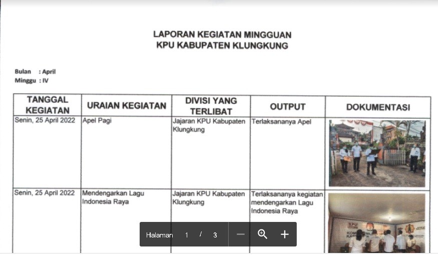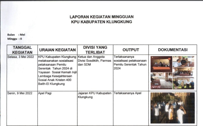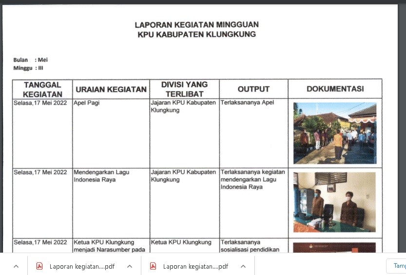 Laporan Kegiatan KPU Kabupaten Klungkung Minggu Ke III Bulan Mei Tahun 2024 Rabu, 25 Mei 2022 00:00 31 Laporan Kegiatan KPU Kabupaten Klungkung Minggu Ke III Bulan Mei Tahun 2024 dapat diunduh disini Baca Selengkapnya