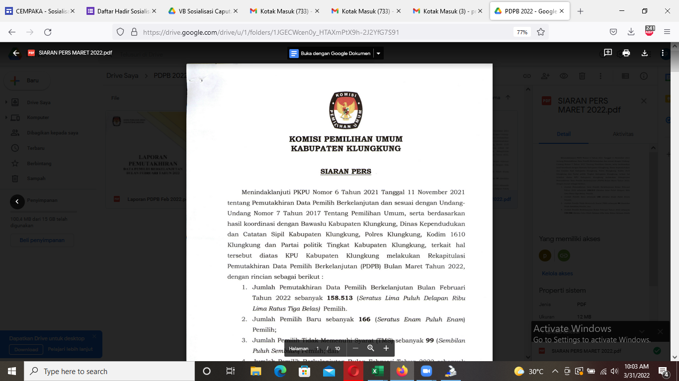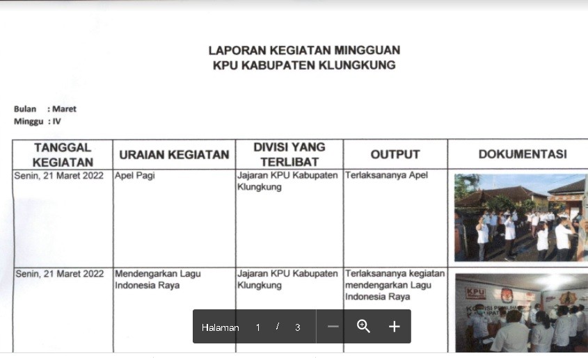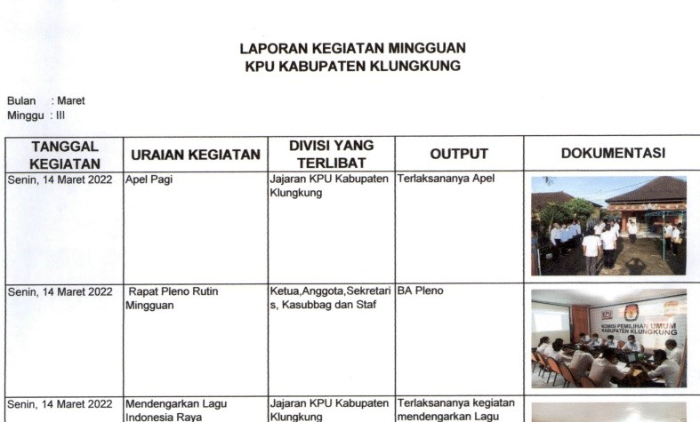 Laporan mingguan kegiatan KPU Klungkung bulan maret 2022 minggu pertama dan kedua Senin, 14 Maret 2022 00:00 51 Laporan Mingguan Bulan Maret Minggu Pertama dan Minggu Kedua dapat di lihat dan di unduh disana Baca Selengkapnya