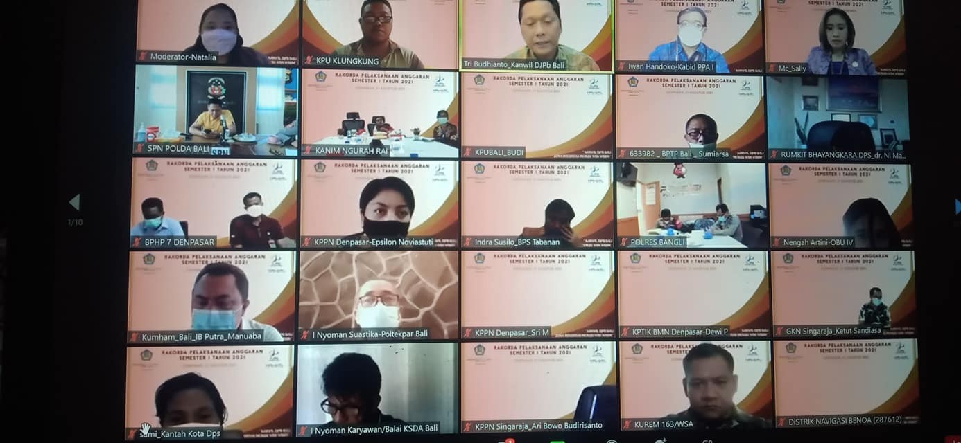 Klungkung, Dirjen Perbendaharaan (DJPB) Provinsi Bali Jumat (27/8/2021) laksanakan Rapat Koordinasi Pelaksanaan Anggaran Semester I Tahun 2020 dengan sistem daring zoom meeting. Rapat yang dibuka Kepala DJPB Bali Tri Budhianto ini dengan Narasumber Salah Satu Kabid Iwan Handoko yang menyampaikan mengenai Revisi DIPA, IKPA, ADK Kontrak, Capain Output, , RDP, UP dan TUP. Sedangkan Kepala Bidang Lainnya Woro menyampaikan mengenai Pembangunan Zona Integritas di lingkungan Kementrian Keuangan Provinsi Bali. KPU Kabupaten Klungkung dalam kesempatan ini hadir Sekretaris I Wayan Putra Suijana. (putras)