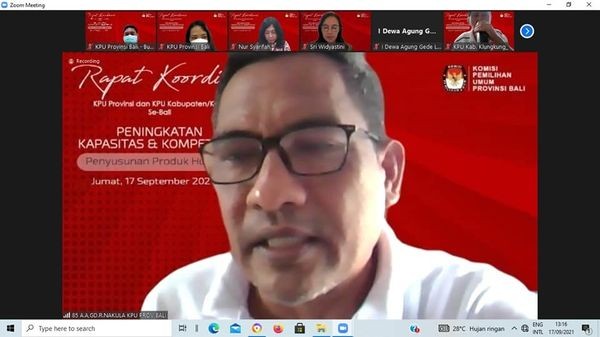 Rakor Penyusunan Produk Hukum KPU Bali Berlangsung Dialogis Komisi Pemilihan Umum (KPU) Bali, melaksanakan rapat kordinasi, Jumat (16/9) lewat daring dengan narasumber Kepala Biro Hukum KPU- RI, Nur Syarifah. Rapat berlangsung dengan suasana dialogis.Peserta antusias mengikuti rapat dan banyak pertanyaan yang dilontarkan peserta sehingga diskusi berlangsung hingga larut sore. Acara yang dibuka dan ditutup Ketua KPU Bali, Dewa Agung Gede Lidartawan diikuti komisioner dan sekretariat KPU Bali dan komisioner dan sekretariat KPU kabupaten/ kota membedah tentang penyusunan produk hukum.Diawali dengan pemaparan materi oleh Mba Inung panggilan akrab Nur Syarifah menyangkut hal tekhnis penyusunan produk hukum.Materi sebagaimana ditampilkan di slide meliputi tugas dan fungsi Biro Perundang- undangan, tentang diskresi sampai mengenai ciri- ciri bahasa hukum.Ciri- ciri bahasa hukum papar Mba Inung yakni lugas, bercorak hemat kata, obyektif dan tidak subyektif ( emosi dalam mengungkapkan tujuan atau maksud) serta penulisan kata bermakna tunggal dan membakukan makna kata.Mengenai diskresi(keputusan yang diambil atas dasar penilaian sendiri), Inung menyampaikan asas- asas diskresi yaitu asas yuridikitas ( hukum), asas efektifitas, efisien, legalitas, asas moralitas, legitimite dan asas perkembangan Iptek. Saat memasuki sesi diskusi muncul banyak pertanyaan, seperti tentang perbedaan surat keputusan dan keputusan oleh Ketua KPU Klungkung, Gusti Lanang Mega Saskara, pertanyaan dari Nur Sodiq, Divisi Hukum KPU Badung, usul Ketua KPU Kota Denpasar, Wayan Arsa Jaya perlunya template, perlunya ada SDM tersetifikasi untuk kehandalan penyusunan produk hukum dan menyinggung soal Silon.Ada pertanyaan sangat tekhnis dari Tia, sekretariat KPU Bali yang saat itu juga sebagai pemandu acara.Berbagai pertanyaan dijawab oleh Inung pada rakor yang dimoderatori AA Gede Raka Nakula itu.Dia berjanji bakal mengusahakan pengadaan template." Kami sudah mendorong di KPU dibuat template, kami akan usahakan untuk persiapkan", ujarnya sembari mengakui potensialnya dipermasalahkannya produk hukum dan disengketakannya produk- produk hukum termasuk kesalahan saat tidak menulis jam dan menit pada keputusan ( produk hukum).Sedangkan usul tentang adanya SDM tersertifikasi, Inung mengatakan hal itu sulit dilakukan karena KPU- RI dihadapkan pada keterbatasan anggaran. Menjawab pertanyaan peserta dia menambahkan ketika ada template bidang/ sub bidang bagian lain yang tidak sesuai dengan pedomam yang berlaku harap dia agar disesuaikan dengan pedoman serta dikomunikasilan ke unit pengusul terhadap penyesuaian dimaksud.Inung memberikan penjelasan sampai detail dan amat tekhnis, karena rakor tersebut memang menyoal tekhnis penyusunan keputusan.( sum)