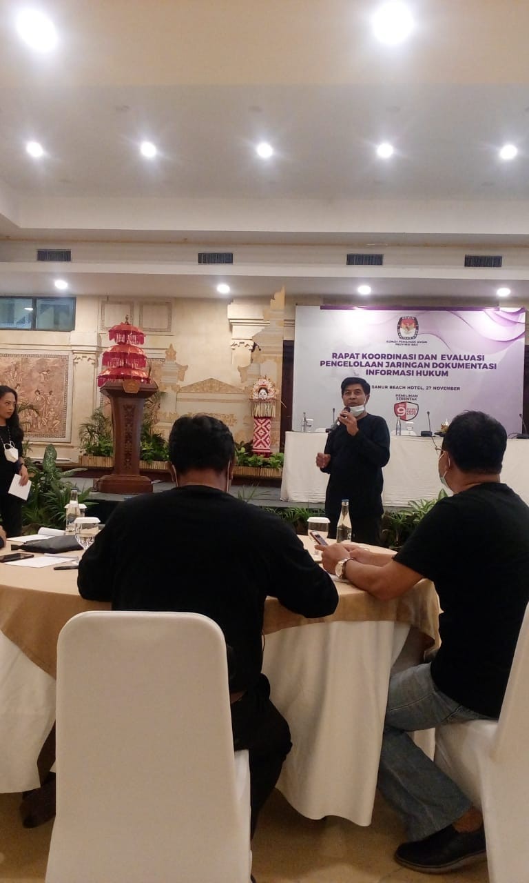 Denpasar,KpU Klungkung mengikuti rapat kordinasi dan evaluasi pengelolaan Jaringan Dokumen dan Informasi Produk Hukum (JDIH), di Hotel Prama Sanur Beah, Denpasar, Jumat (27/11). Acara yang melibatkan KPU se-Bali itu untuk KPU Klungkung dihadiri Divisi Hukum dan Pengawasan, I Wayan Sumerta , Kasubag Hukum Pengawasan, AA Agung Gede Agung dan operator , Ni Nyoman Putri Rusini dan Divisi Tekhnis, Gede Suka Astreawan. Mereka diberikan materi pedoman tekhnis pengelolaan JDIH sebagaimana yang ada dalam Keputudan KPU -RI 533 /2020.Adapun pematerinya yakni Kabag Hukum dan Hupmas KPU, Melgi Karolina Van Harling. Tujuan dari pengelolaan JDIH papar Melgi adalah untuk memudahkan produk hukum diakses publik lewat JDIH.Selain itu untuk memudahkan pencarian kembali dokumen hukum serta untuk menyeragamkan pengelolaan JDIH." Untuk mencari dokumen tersebut cukup lewat genggaman", kias Melgi.Acara itu diisi tanya jawab berhadiah oleh Ibu Tia.Wayan Sumerta diberikan kesempatan utk menjawab pertanyaan dan diberi hadiah.Adapun produk hukum yang bisa diunggah di JDIH yakni keputusan KPU, PKPU, Surat Edaran ,Surat Dinas dan putusan MK, putusan pengadilan, putusan PTUN dan lain-lain. Pemateri lainnya yakni AA Raka Nakula..Nakula mwngatakan KPU-RI mendapat penghargaan pengelolaan JDIH terbaik non kementerian. Nakyla membawakan materi pemilihan berintegritas.Untuk itu penyelenggaraannya senantiasa mengindahkan regulasi. Potensi masalah ads hilangnya yang hak pilih dan lain-lain. (sum)