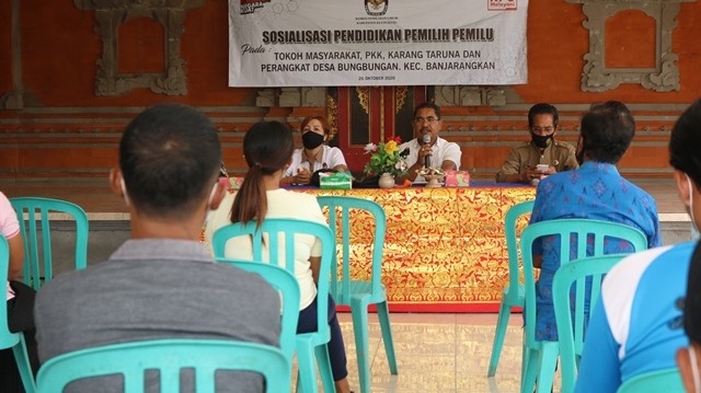 Semarapura, Rendahnya tingkat partisifasi politik masyarakat Desa Bungbungan, Banjarangkan, pada Pemilu 2019 lalu justeru membuahkan pertanyaan dari masyarakat kepada KPU Klungkung selaku penyelenggara Pemilu. Hadir pada Sosialisasi itu Perbekel setempat, I Komang Dana, aparat desa, ibu PKK dan tokoh masyarakat. Mereka antusias mengikuti acara tersebut. Bahkan Sekretaris Desa setempat Ketut Subaga merasa prihatin dengan tingkat partisipasi pemilih di desanya.Namun tidak dijelaskan faktor penyebab rendahnya partisipasi tersebut. Subaga justeru menanyakan strategi yang digunakan KPU Klungkung untuk mengatasi hal itu.Komisioner Ida Bagus Barwata menjelaskan berbagai strategi.Yakni melalui sosialisasi dengan mobil keliling, membuat relawan demokrasi dengan maksuh menyentuh semua segmen masyarakat serta memasang baliho tentang ajakan memilih. Pada agenda sosialisasi pendidikan pemilih oleh KPU Klungkung, di Kantor Desa setempat, Senin (26/10) Ketua Divisi Sosialisasi, Ida Bagus Nyoman Barwata mengatakan tingkat partisipasi masyararakat setempat hanya 72 persen dari tingkat partisipasi rata rata 82 persen lebih bagi kabupaten Klungkung.Karena itu Barwata berharap masyarajat untuk senantiasa meningkatkan kesadaran berbangsa dan memanfaatkan kedaulatan yang diberikan sepenuhnya kepada masyarakat untuk memilih pemimpin."Kedaulatan sepenuhnya ada di tangan rakyat , manfaatkan kedaulatan itu dengan cara ikut menggunakan hak pilih",ujarnya. Sosialisasi juga diisi materi tentang data pemilih oleh Sang Ayu Mudiasih.Sedangkan komisioner , Wayan Sumerta mengingatkan untuk tidak melakukan politik uang.Karena sanksinya pidana."Pilihlah pemimpin yang berkualitas tanpa melihat uang, agar lahir pemimpin yang mampu melahirkan kebijakan publik yang dapat menyejahterakan rakyat", tegasnya. (sum)