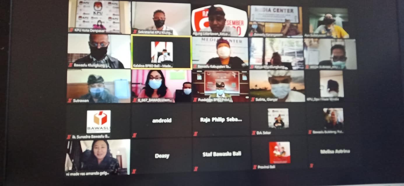 Semarapura, Dilaksanakan oleh Badan Penanggulangan Bencana Daerah Provinsi Bali, lakukan diskusi Pilkada yang berkaitan Pengurangan Resiko Bencana Menuju Pilkada Serentak, Bali Bebas Covid-19 melalui Daring Zoom Meeting Kamis (8/10/2020). Dibuka oleh Moderator Ayu Sulistyowati memberikan kesempatan kepada Kalak BPBD Bali I Made Retin menyampaikan materi dimana dirinya menyampaikan tujuan dan ihlwal pelaksanaan kegiatan ini. Selain itu Retin menyatakan bahwa pandemi Covid-19 itu nyata, dan berharap adanya disiplin protokol kesehatan saat Pilkada nantinya.